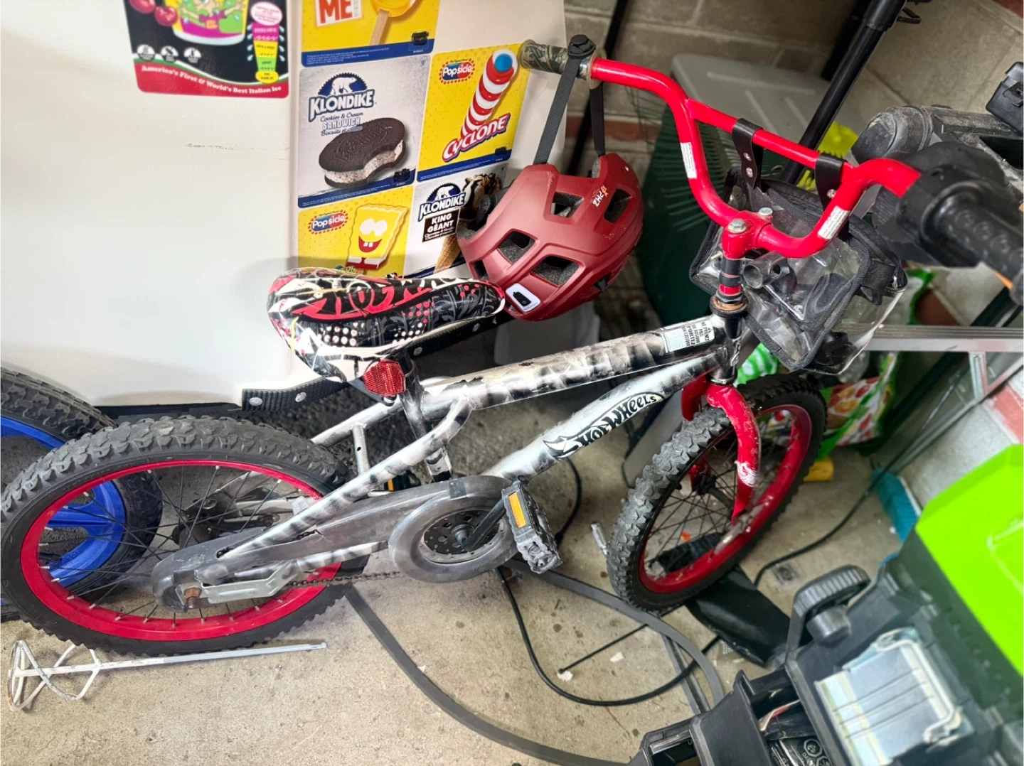 Selling a Hot Wheels kids' bike! The bike has a red and white frame with Hot Wheels graphics. Perfect for young riders! No training wheel