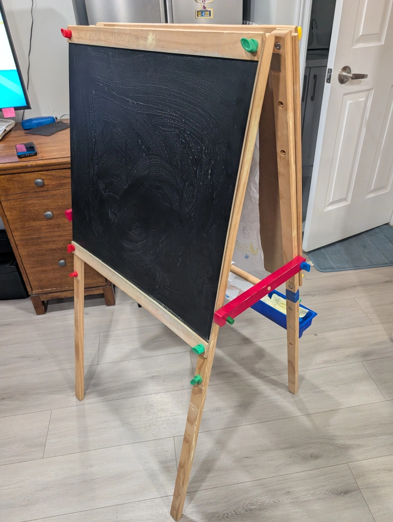 38Kids easel board in good condition. It has a black chalkboard on one side and a whiteboard on the other. Perfect for your little artist!