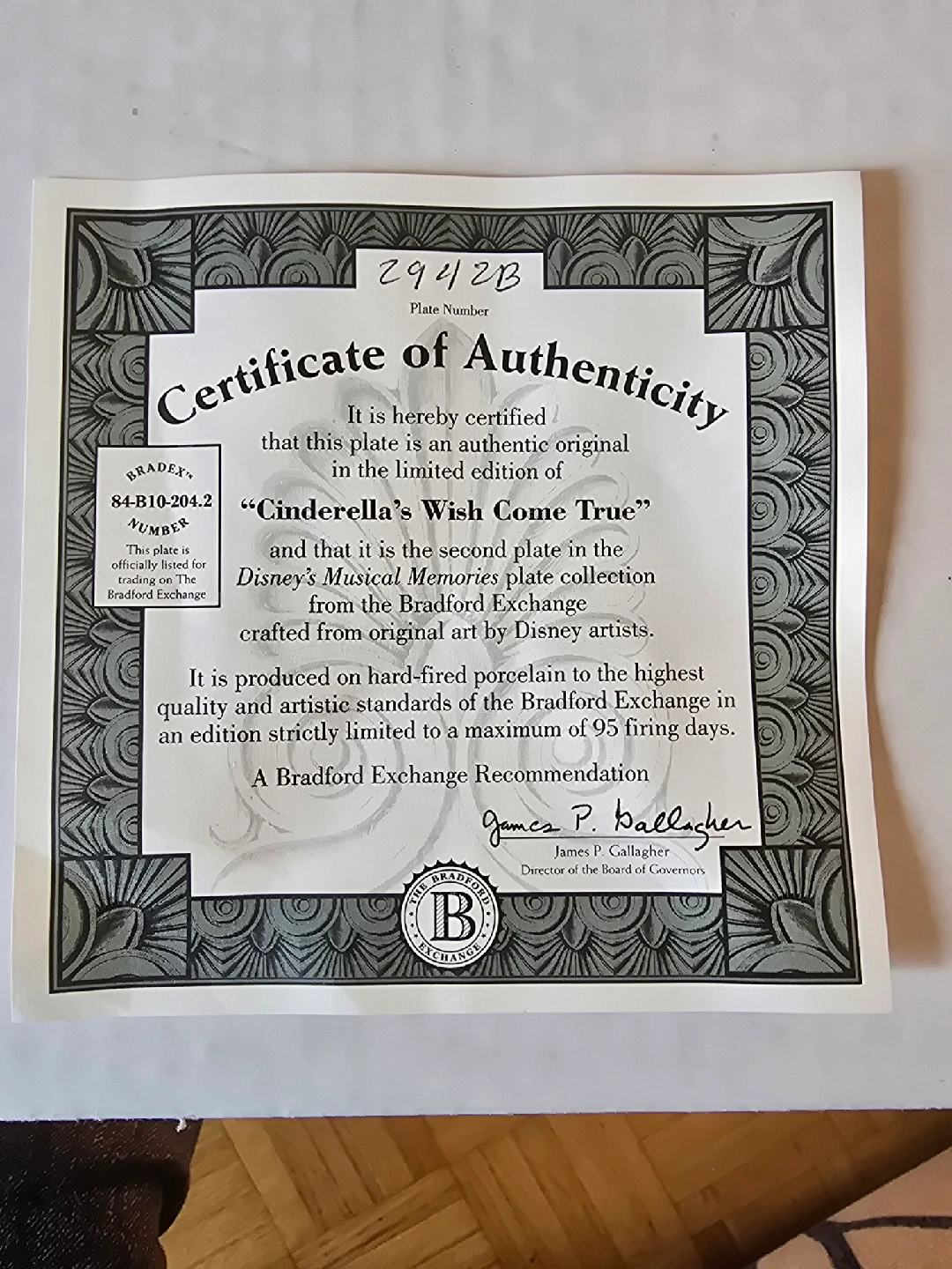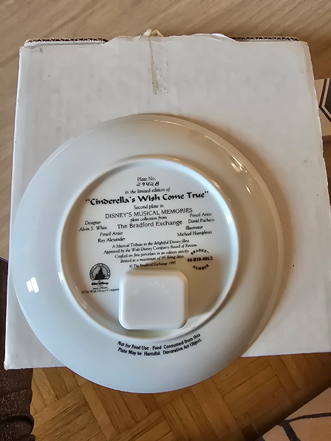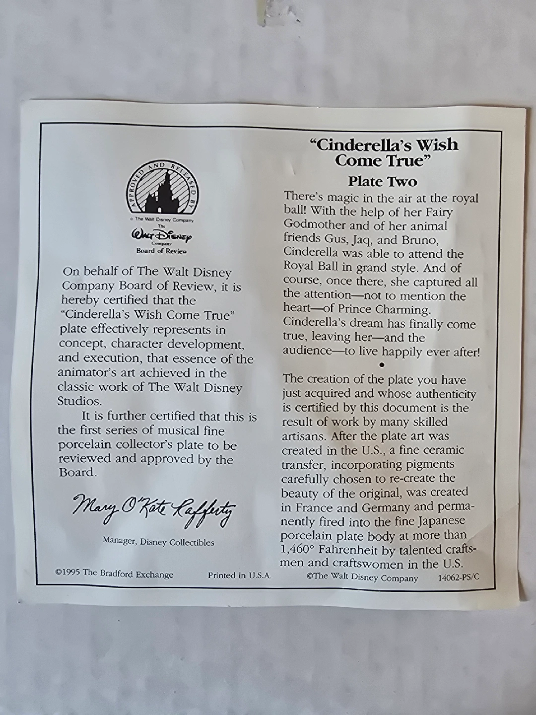 65Selling a Bradford Exchange collector's plate titled "Cinderella's Wish Come True" from the Disney's Musical Memories plate collection. This plate is the second in the series and comes with a certificate of authenticity. It's made of hard-fired porcelain and is in excellent condition