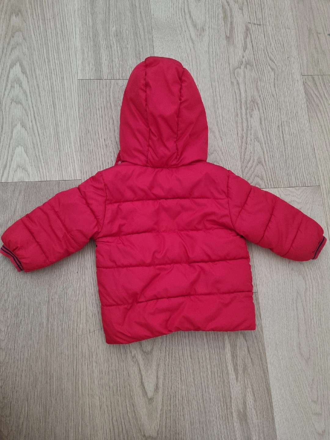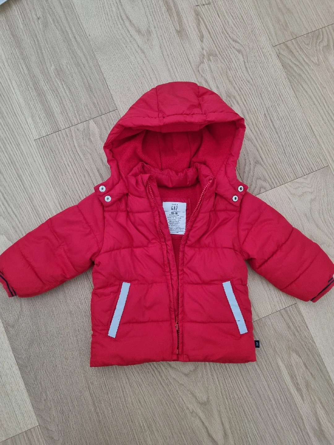 A cute red puffer jacket from Baby Gap! It's sized for 12-18 months. The jacket features a water-resistant fabric and is made with 100% recycled fill. Perfect for keeping your little one warm!