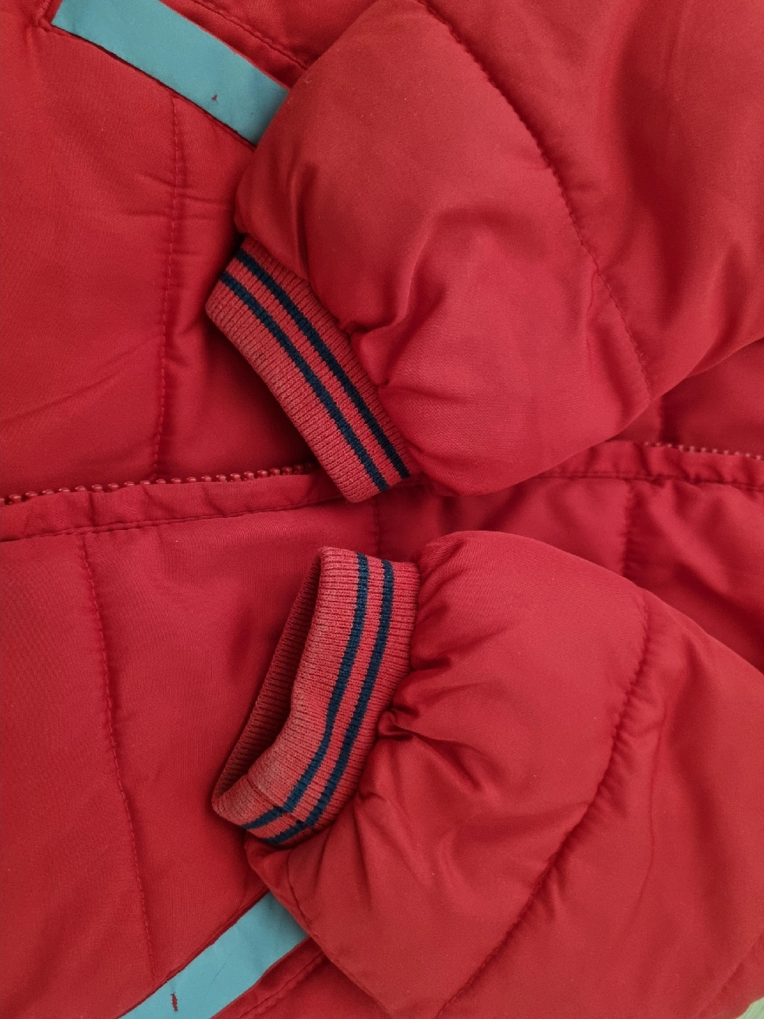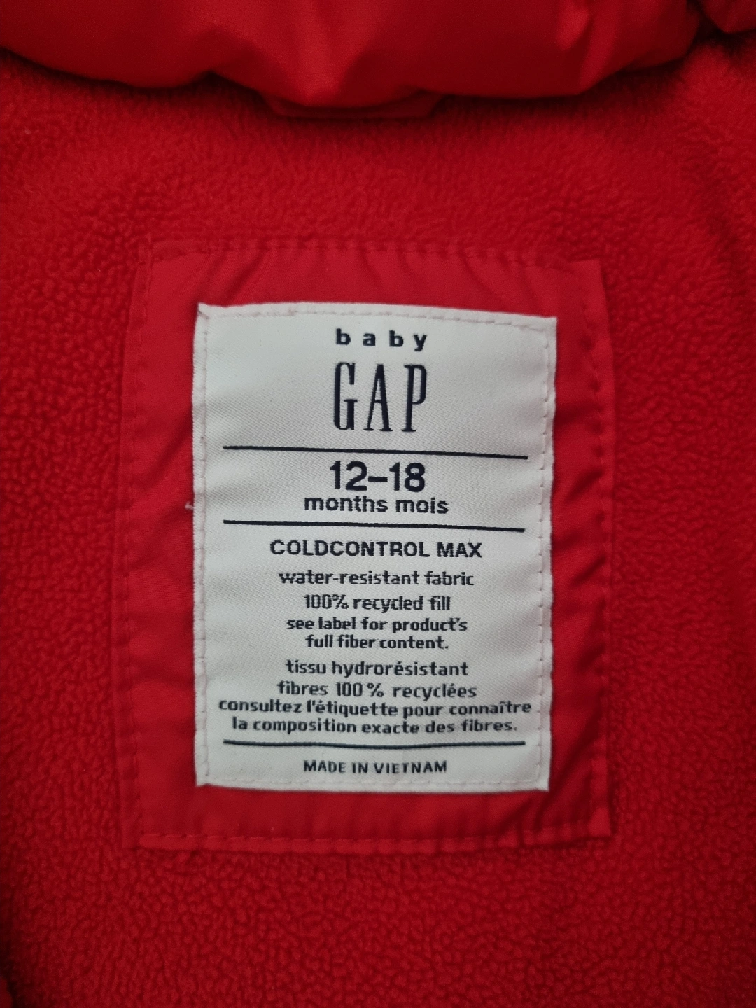 A cute red puffer jacket from Baby Gap! It's sized for 12-18 months. The jacket features a water-resistant fabric and is made with 100% recycled fill. Perfect for keeping your little one warm!