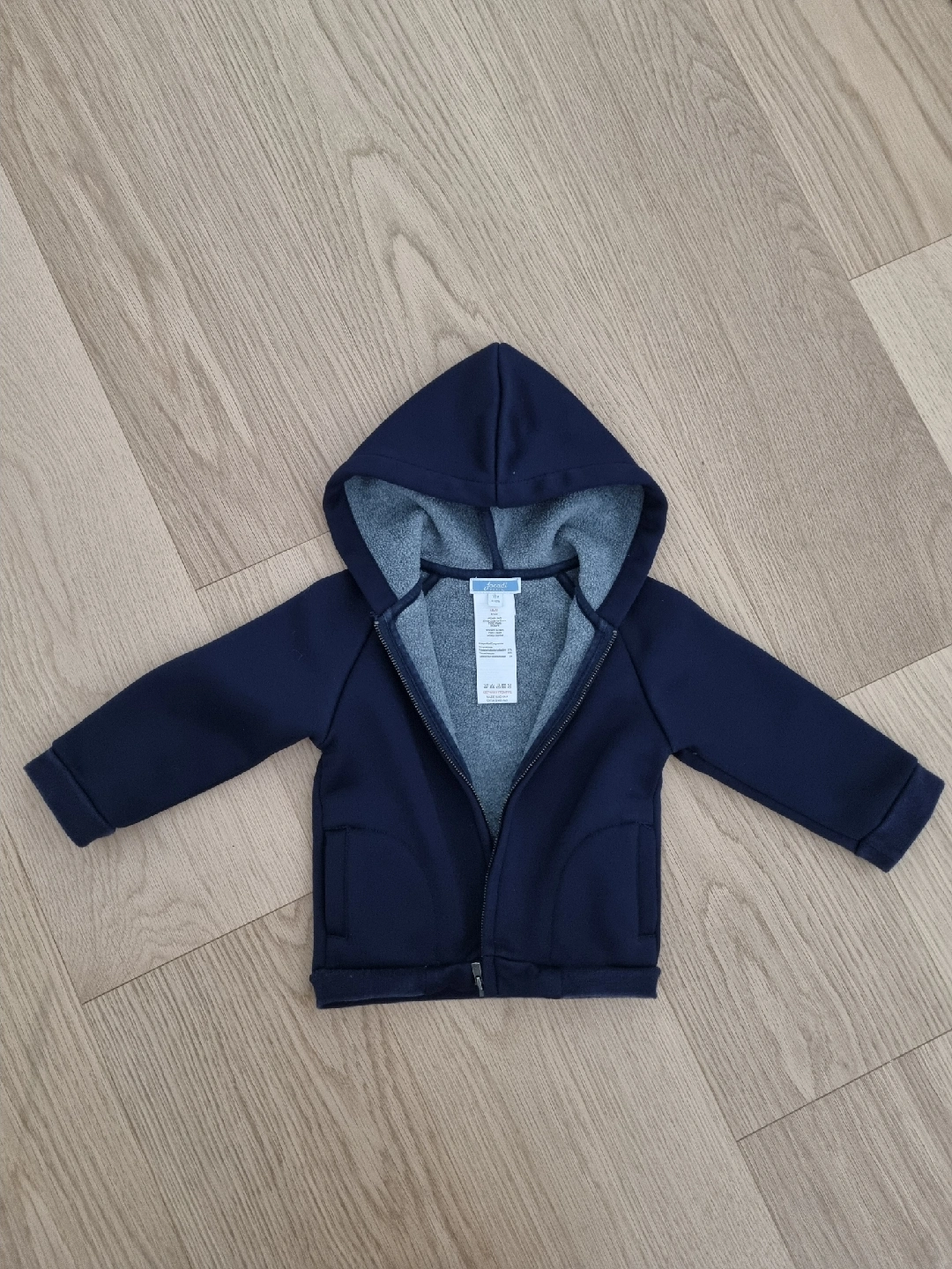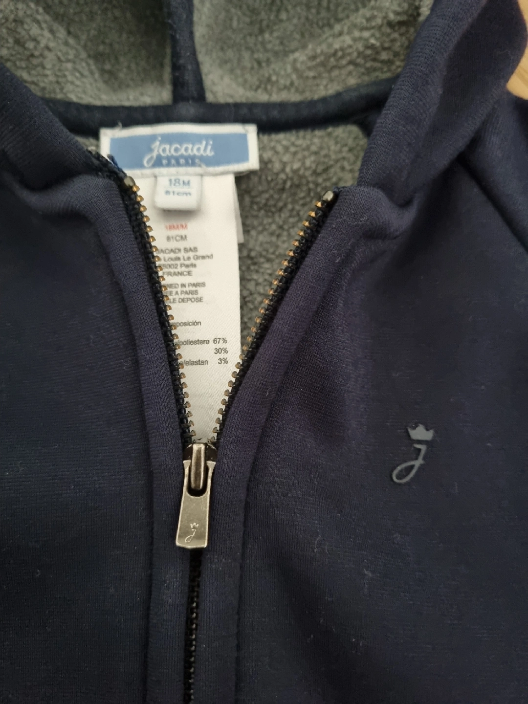 A cozy navy blue fleece hoodie from Jacadi Paris, perfect for keeping your little one warm! The size is 18M (81cm). Made with a blend of polyester, viscose, and elastane for comfort and durability. Like new conditon from NSNP home.