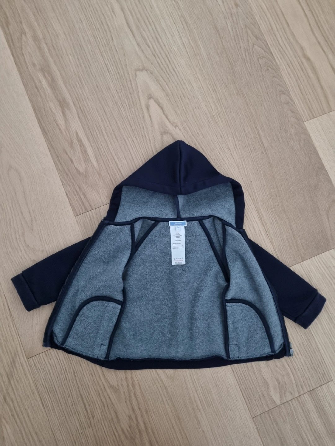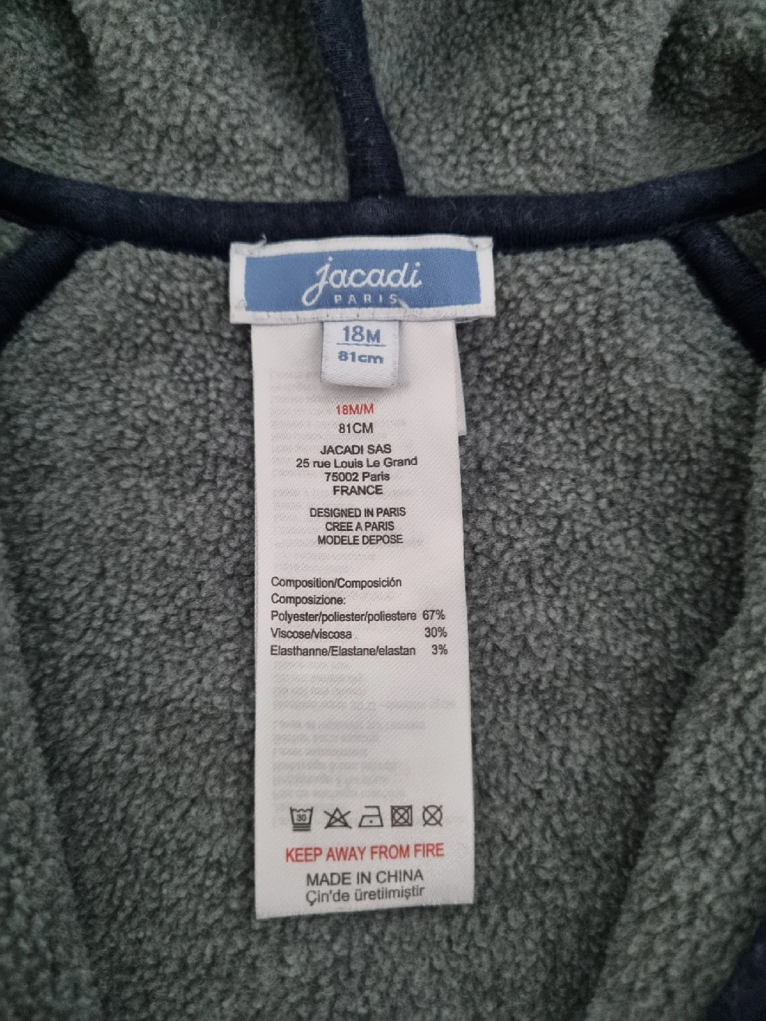 A cozy navy blue fleece hoodie from Jacadi Paris, perfect for keeping your little one warm! The size is 18M (81cm). Made with a blend of polyester, viscose, and elastane for comfort and durability. Like new conditon from NSNP home.