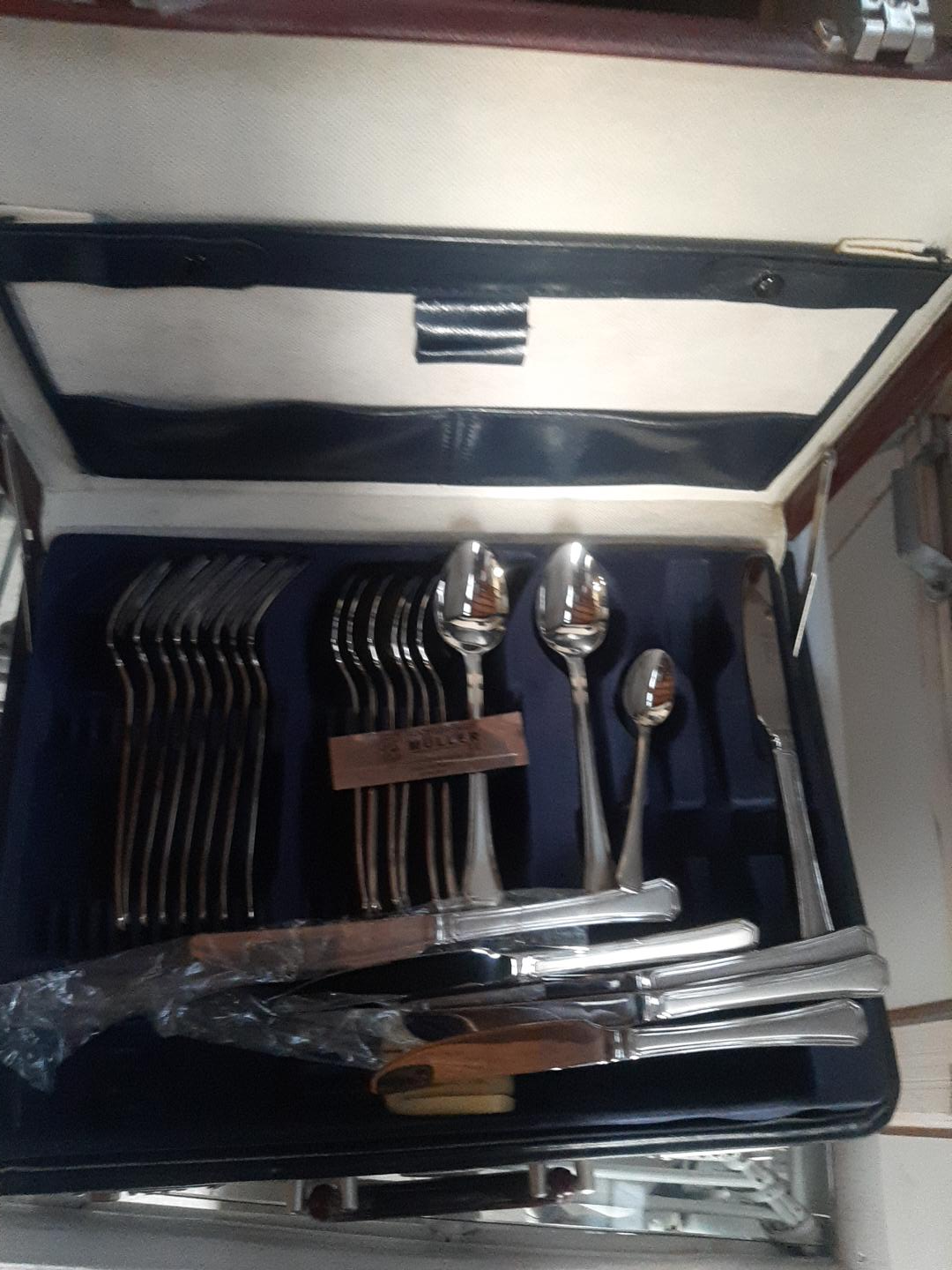 60Haus Müller 72-piece cutlery set, designed for 12 place settings. This extensive set includes various pieces like dinner forks, knives, spoons, teaspoons, and serving utensils. It's made from high-quality stainless steel, offering durability and corrosion resistance. The set features an ergonomic design for a comfortable grip and a shiny finish for a luxurious appearance, suitable for both everyday use and special occasions.