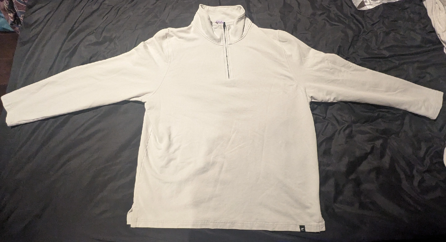 Selling a men's quarter-zip pullover in size L. Recently dry-cleaned! It's a stylish and comfortable piece, perfect for layering or wearing on its own. The neutral colour makes it versatile for different outfits. In great condition!