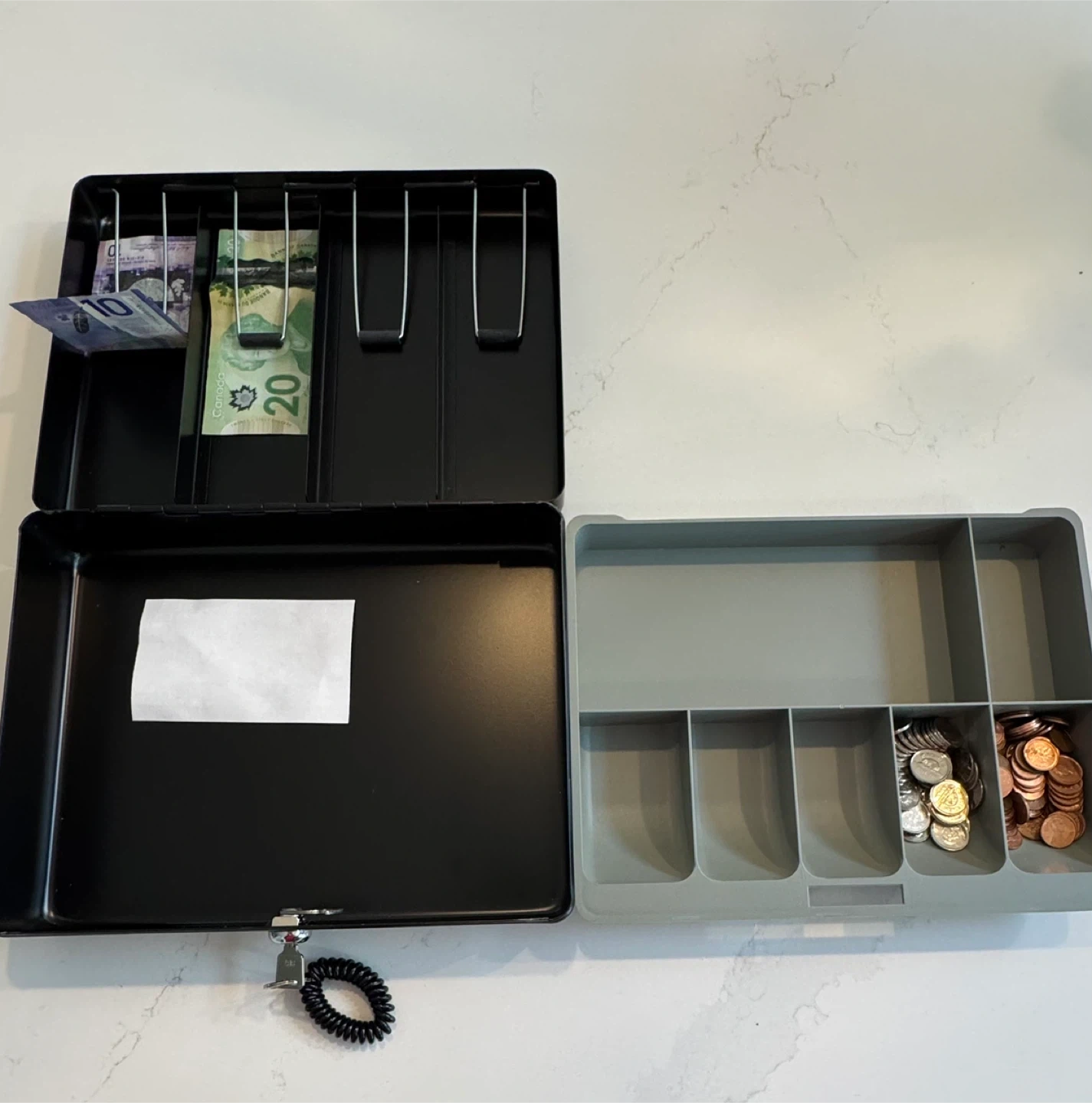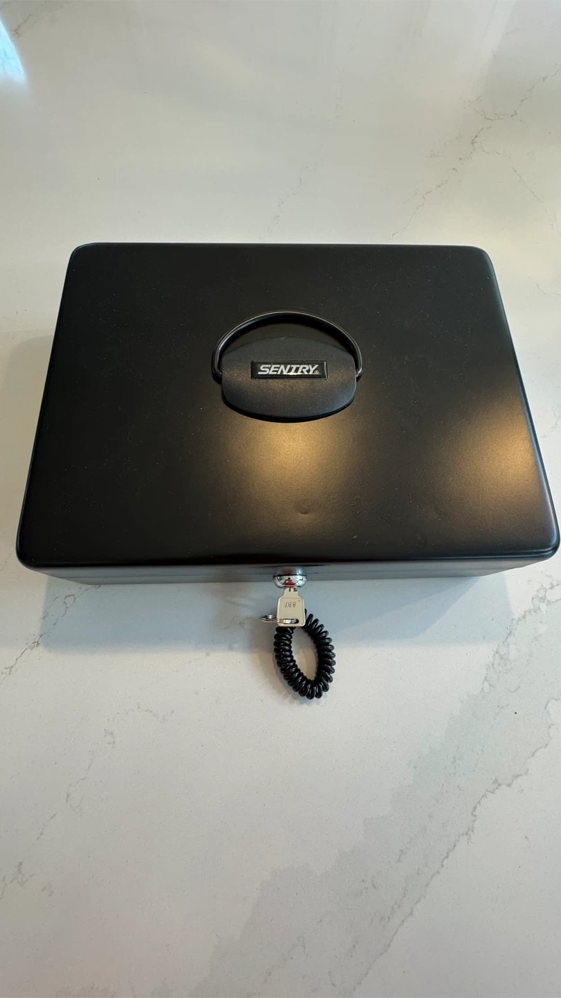 Selling a Sentry cash box in great condition! It's black on the outside and grey on the inside. Comes with a key to keep your cash safe and organized. Perfect for small businesses, markets, or even just keeping your change sorted at home. Bill clips keep cash flat and organized. Solid steel construction for durable and reliable protection. (Cash and coins in picture not included)