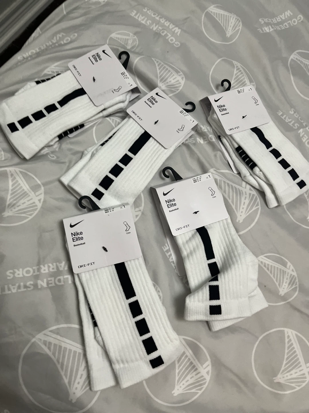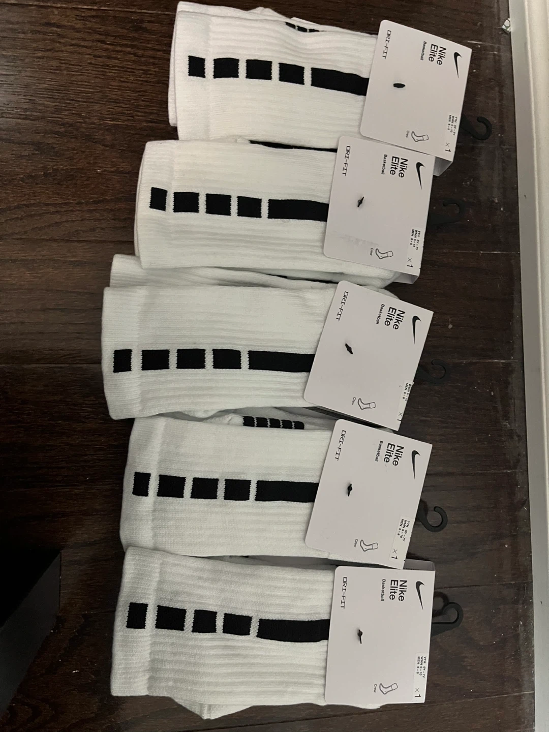 Selling a set of Nike Elite Basketball Crew Socks in size M. They are white with black accents and are made with Dri-FIT material.