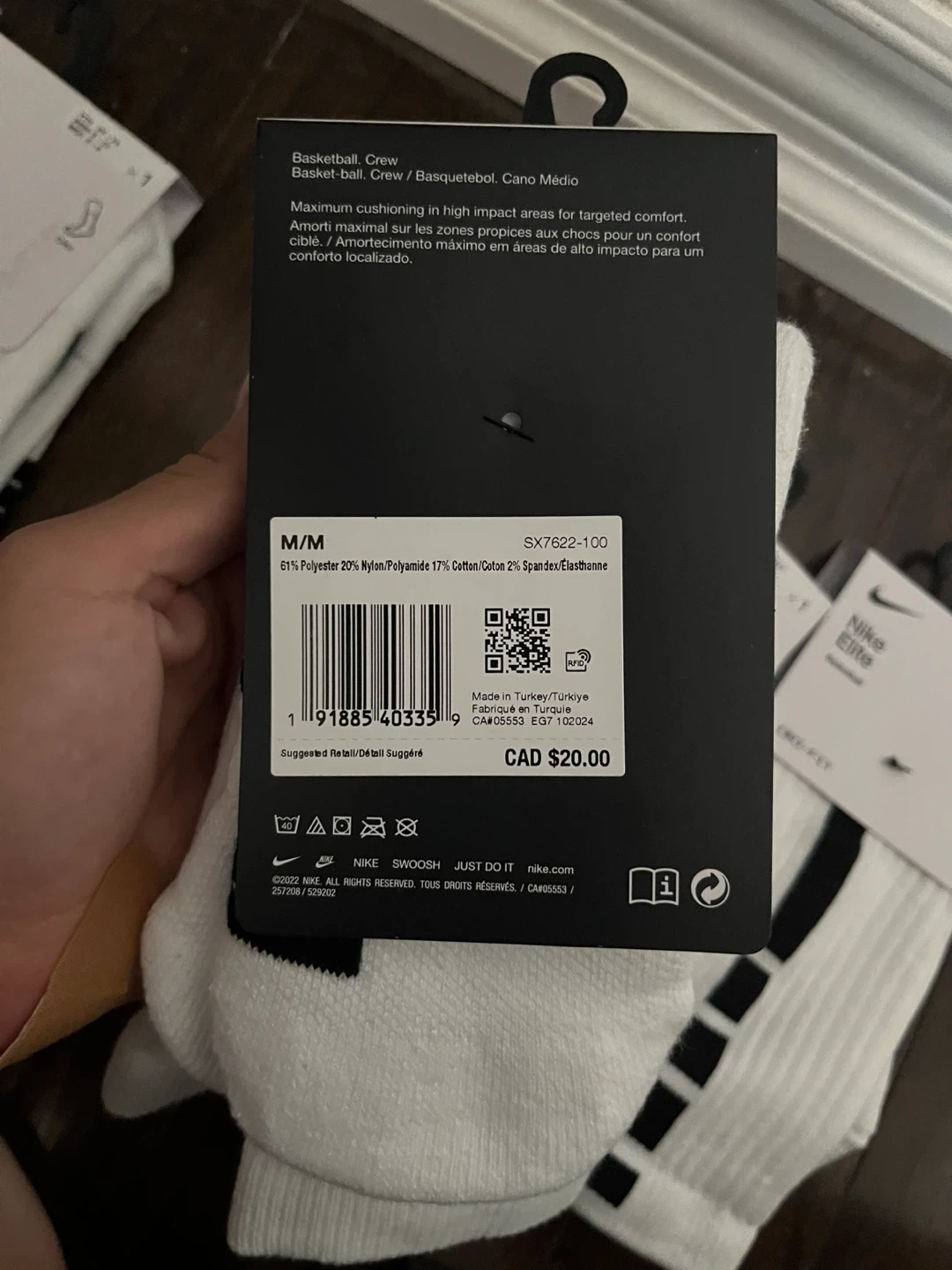 Selling a set of Nike Elite Basketball Crew Socks in size M. They are white with black accents and are made with Dri-FIT material.