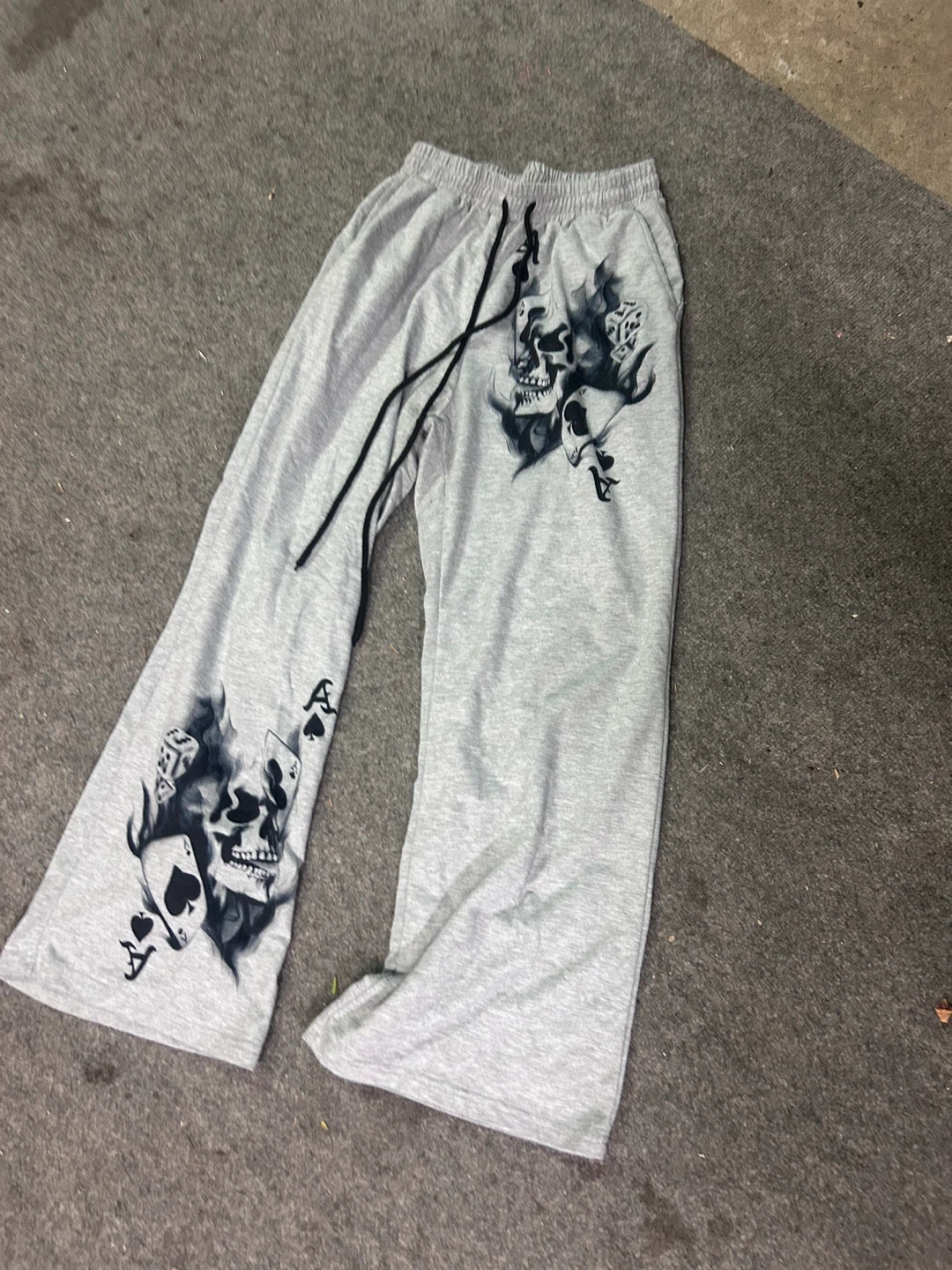 Selling a pair of grey sweatpants with a skull and playing card design. They have a drawstring waist and a relaxed fit.