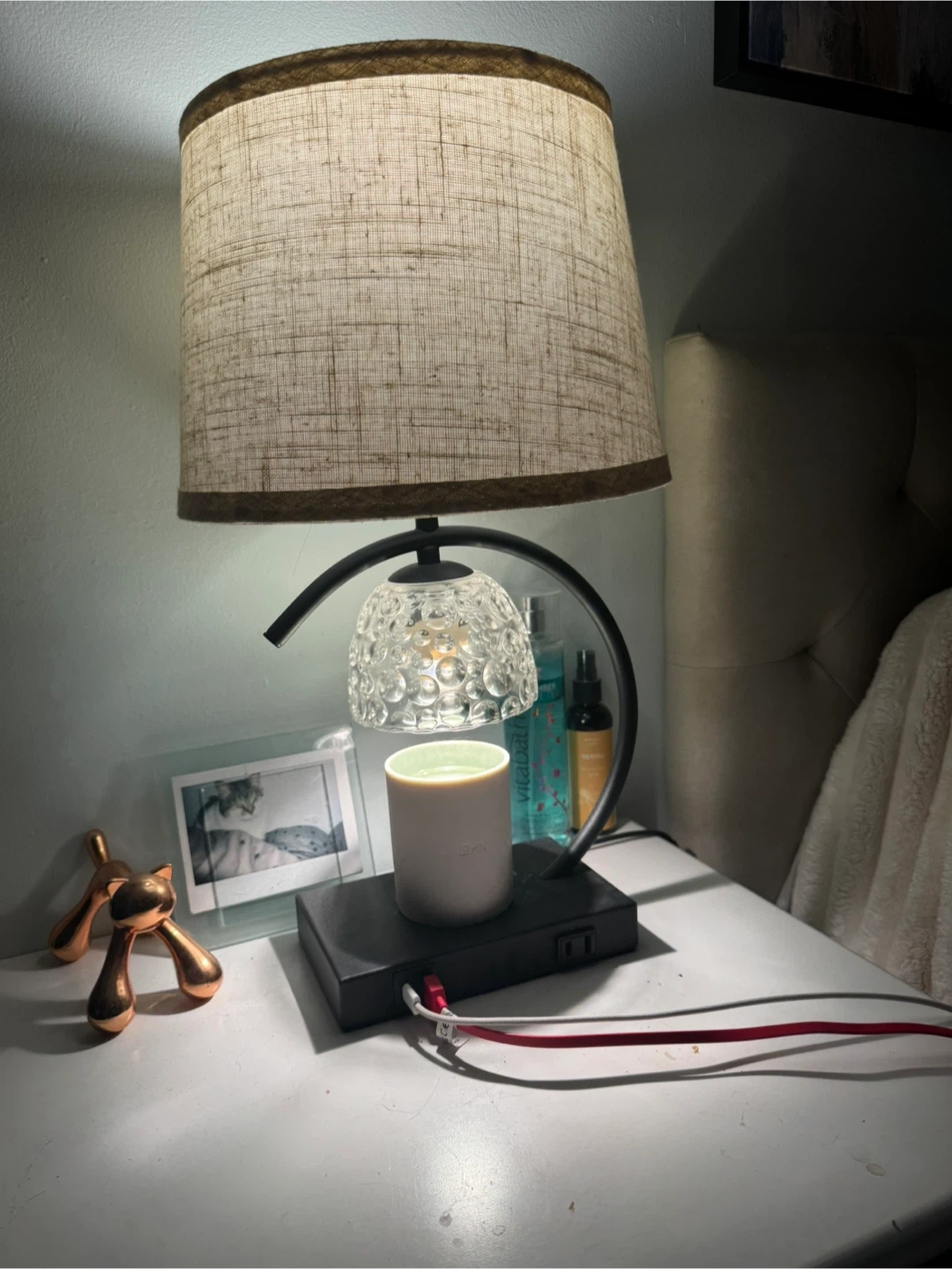 Touch control lamp w/built in candle warmer. Lamp has 3 different light settings (cool, warm and bright) and it has USB and USB-C ports in the base for charging.