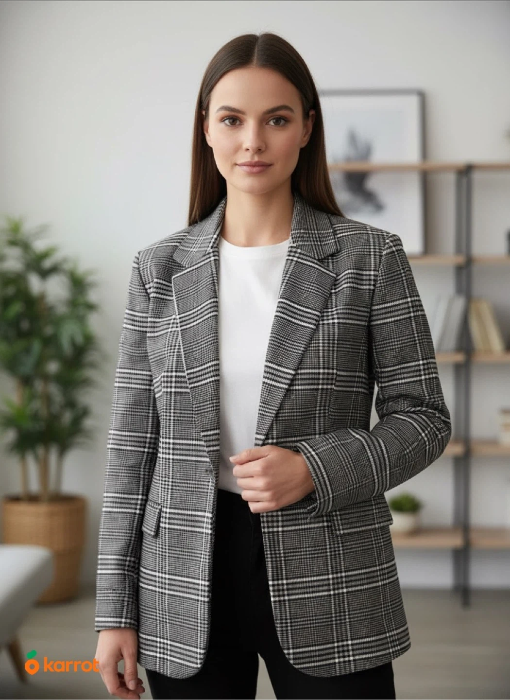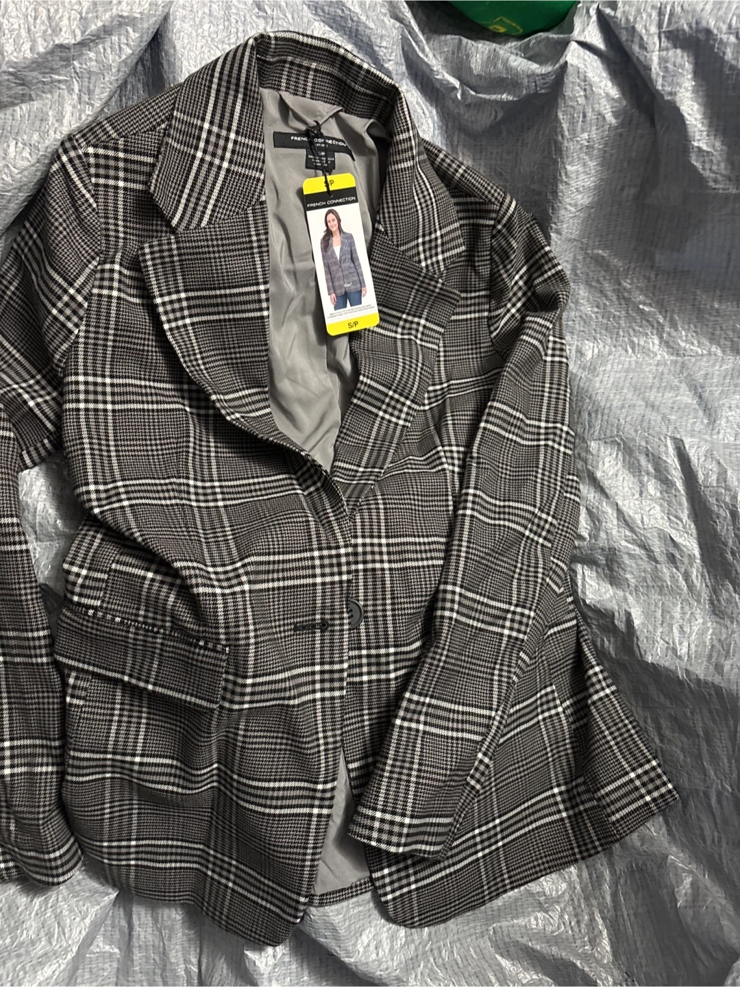 This is a French Connection plaid blazer in size small. It has a classic and stylish look, perfect for dressing up or down. The blazer is in great condition and ready for a new home!