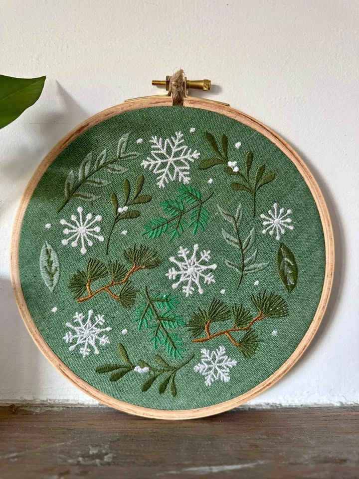 Beautiful hand-stitched winter embroidery featuring detailed snowflakes, pine branches, and greenery. Stretched in an 8.5-inch wooden hoop – perfect for hanging or displaying on a shelf. Adds a cozy woodland touch to winter, holiday, or cabin décor. ✨ One-of-a-kind handmade embroidery ✨ Great seasonal décor or thoughtful holiday gift ✨ Green fabric background with white + green thread details Woodland Mushroom Embroidery Hoop also available. $55 for each hoop or the pair for $95 Porch pick up Christie St and St. Clair West Ave (10 min walk from St. Clair WEST Subway station). Cash only