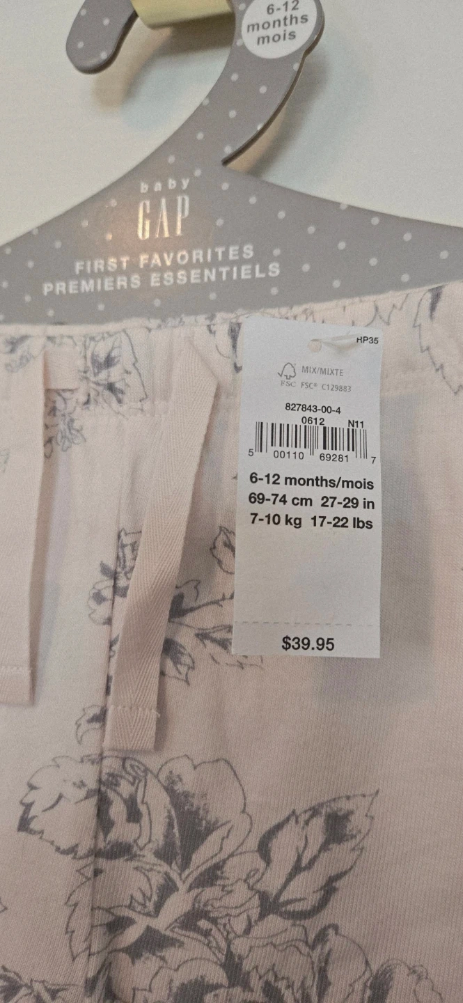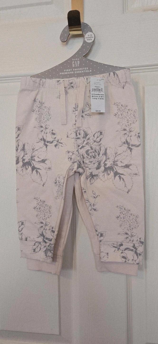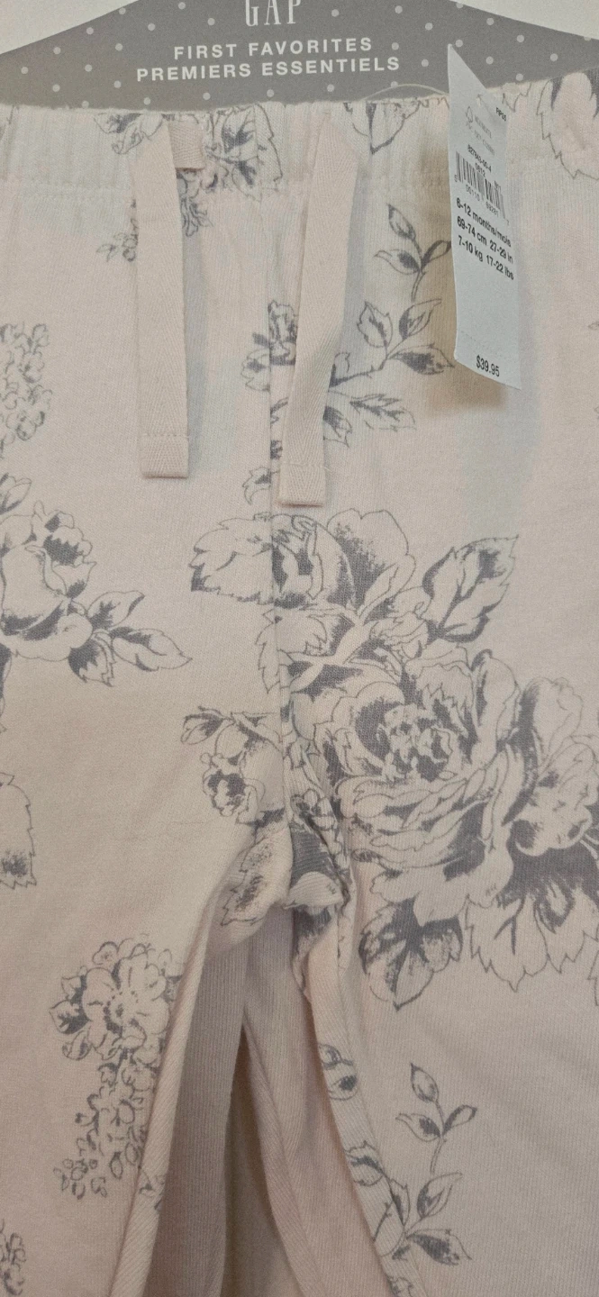New. 2 pk. Beautiful lightweight These pink Baby Gap pants feature a grey floral print. They're designed for babies aged 6-12 months, fitting 27-29 inches and 17-22 lbs. Made for comfort, these pants are great for everyday wear.
