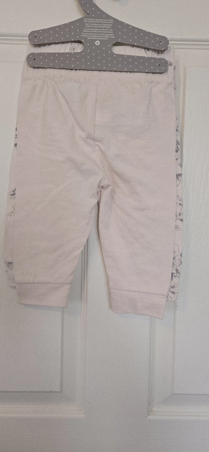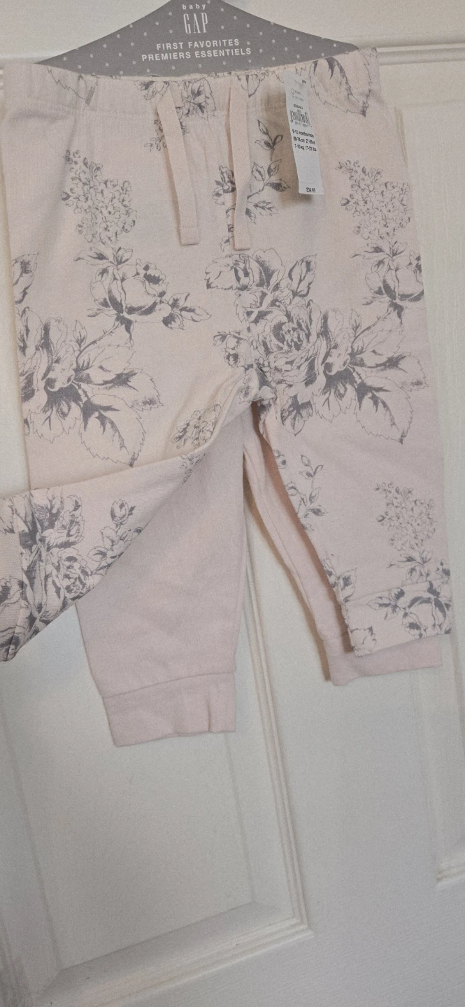 New. 2 pk. Beautiful lightweight These pink Baby Gap pants feature a grey floral print. They're designed for babies aged 6-12 months, fitting 27-29 inches and 17-22 lbs. Made for comfort, these pants are great for everyday wear.