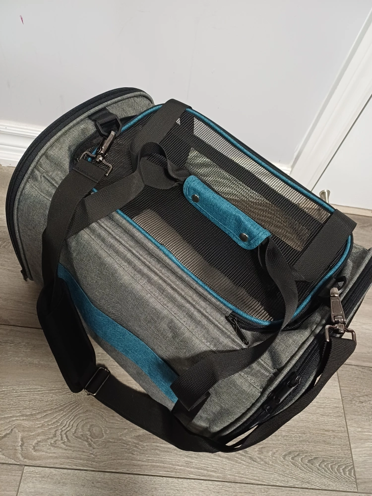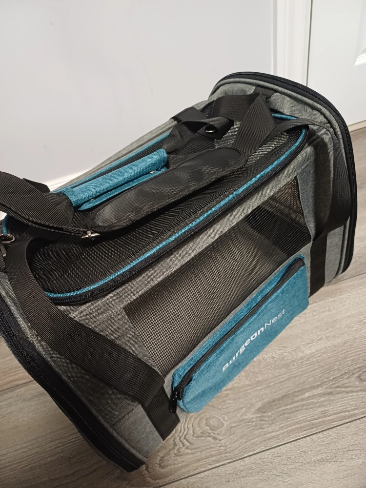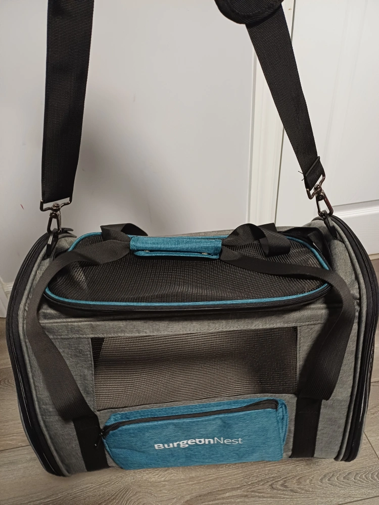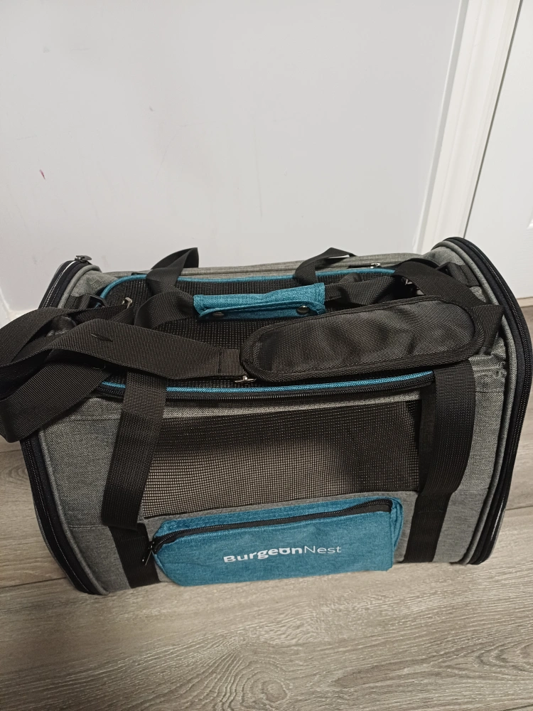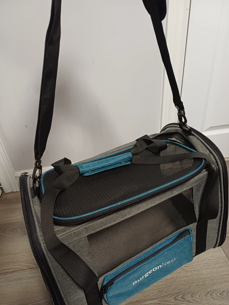 96Selling a Brand New BurgeonNest pet carrier in super excellent condition. It features a grey and teal colour scheme, with mesh windows for ventilation and visibility. Perfect for transporting your furry friend safely and comfortably! 17x12.5x11