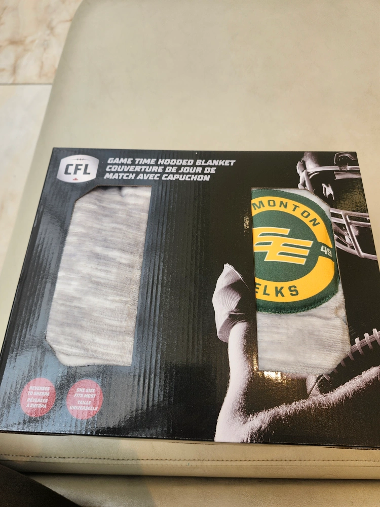 Selling a brand new Edmonton Elks Game Time Hooded Blanket, still in its original box! It's made of 100% polyester and is one size fits most. Perfect for staying cozy while supporting your team! The blanket reverses to sherpa for extra warmth. Body length: 44 in (112 cm), chest width: 31.5 in (80 cm)
