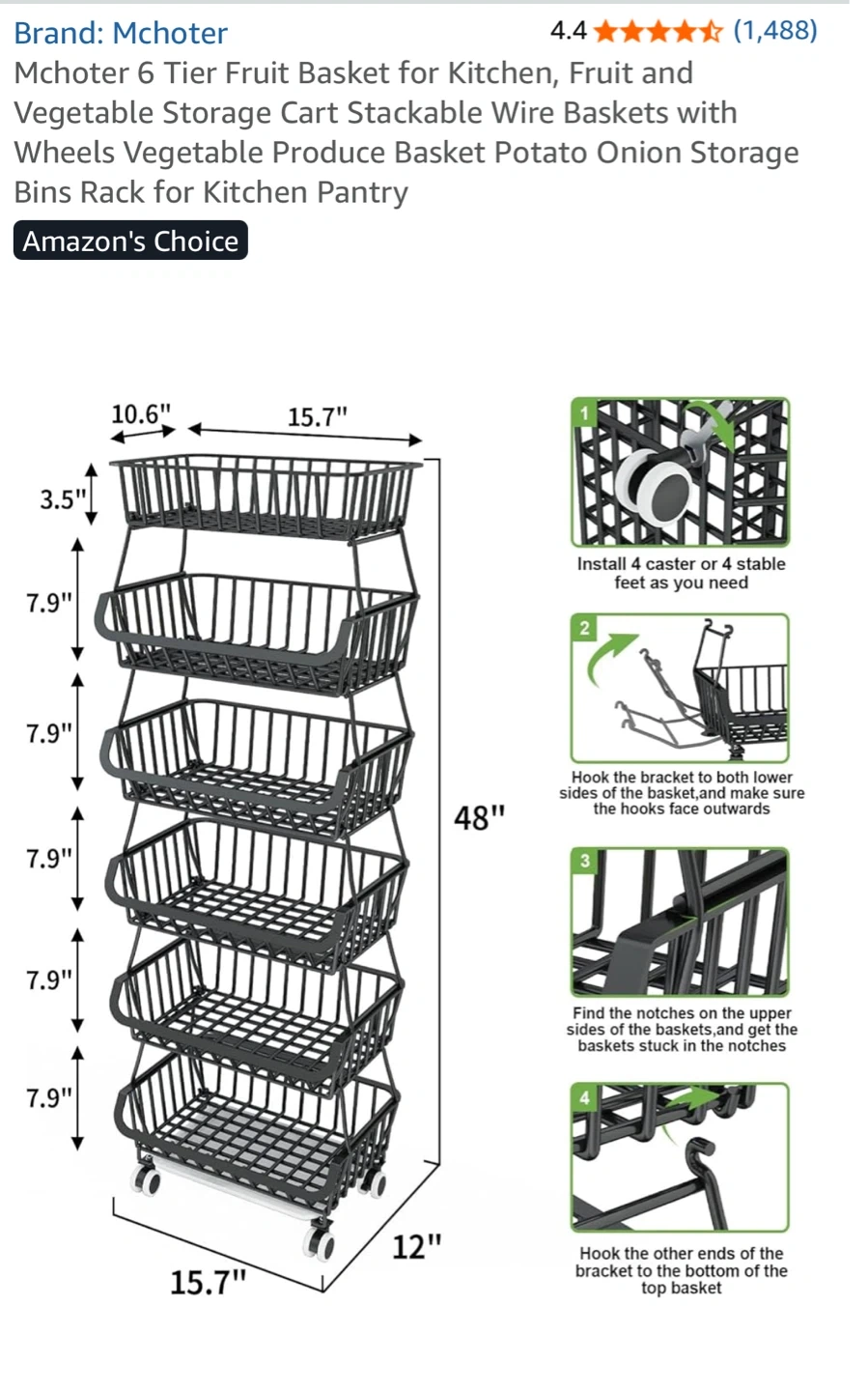 Keep your kitchen organized with this Mchoter 6-tier fruit and vegetable storage cart! It's perfect for storing fruits, vegetables, and other produce. The stackable wire baskets provide ample storage space, and the wheels make it easy to move around your kitchen or pantry. It's in great condition and ready to use