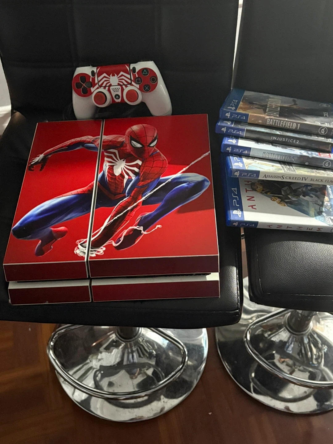 Selling a PlayStation 4 with a custom Spiderman skin. Includes a Spiderman-themed controller and several games: Assassin's Creed Black Flag, Battlefield 1, Injustice 2, Battlefield 4, and Anthem