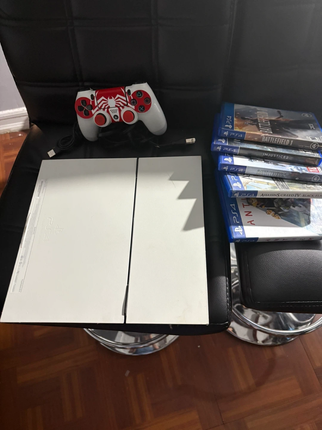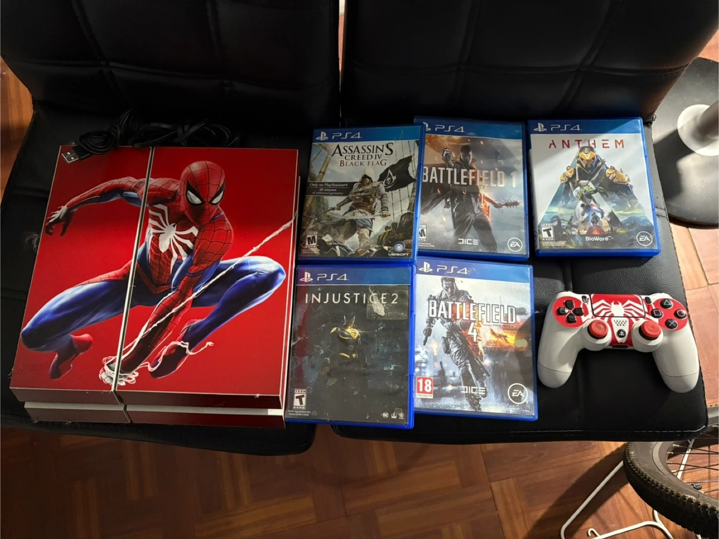 Selling a PlayStation 4 with a custom Spiderman skin. Includes a Spiderman-themed controller and several games: Assassin's Creed Black Flag, Battlefield 1, Injustice 2, Battlefield 4, and Anthem