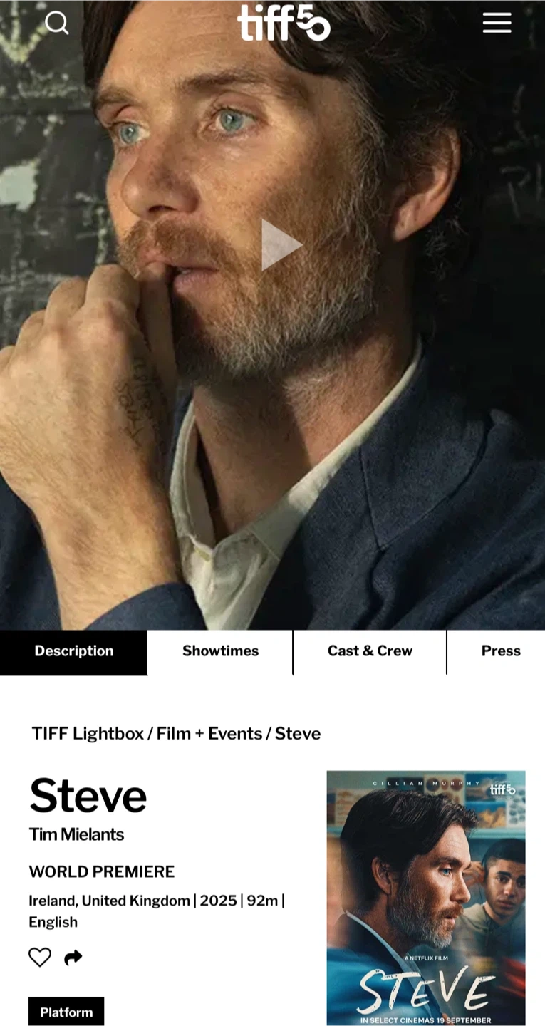 TIFF movie STEVE w/ Cillian Murphy on Tuesday, Sep 9th at 1245pm