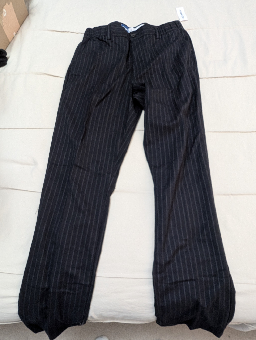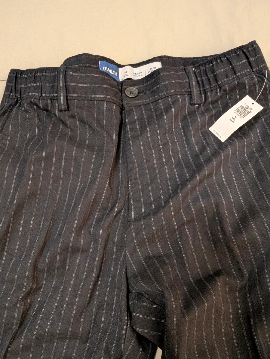 I'm selling a pair of Old Navy pinstripe trousers in size medium tall. They are a straight fit and in new condition! Perfect for a casual or dressy look
