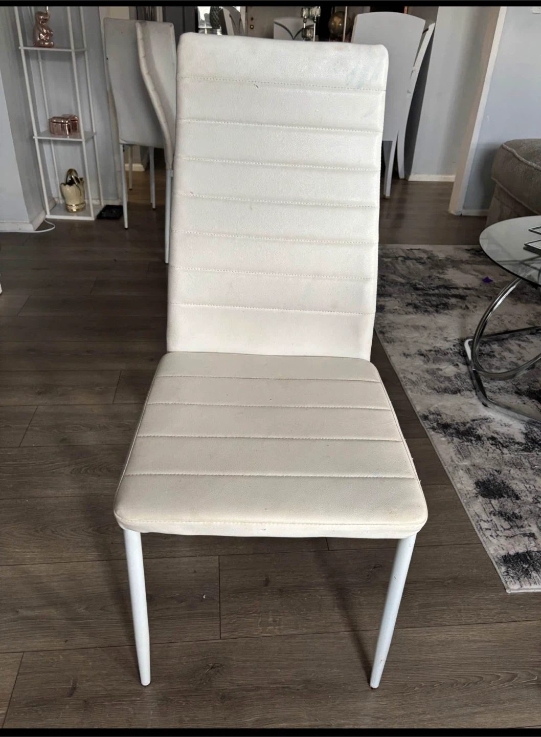 Selling a set of 4 white dining chairs with a modern, sleek design. They feature a comfortable padded seat and back with horizontal stitching detail, supported by sturdy white legs.