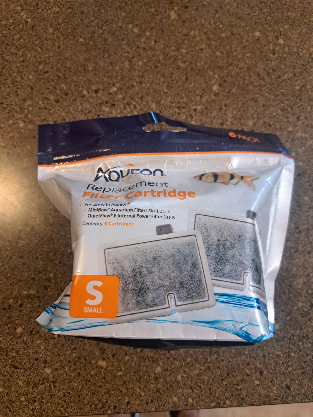 Selling a pack of Aqueon replacement filter cartridges. These are size small and come with 6 cartridges in the pack. They're for use with Aqueon MiniBow aquarium filters size 1, 2.5, and 5, as well as QuietFlow E internal power filter size 10