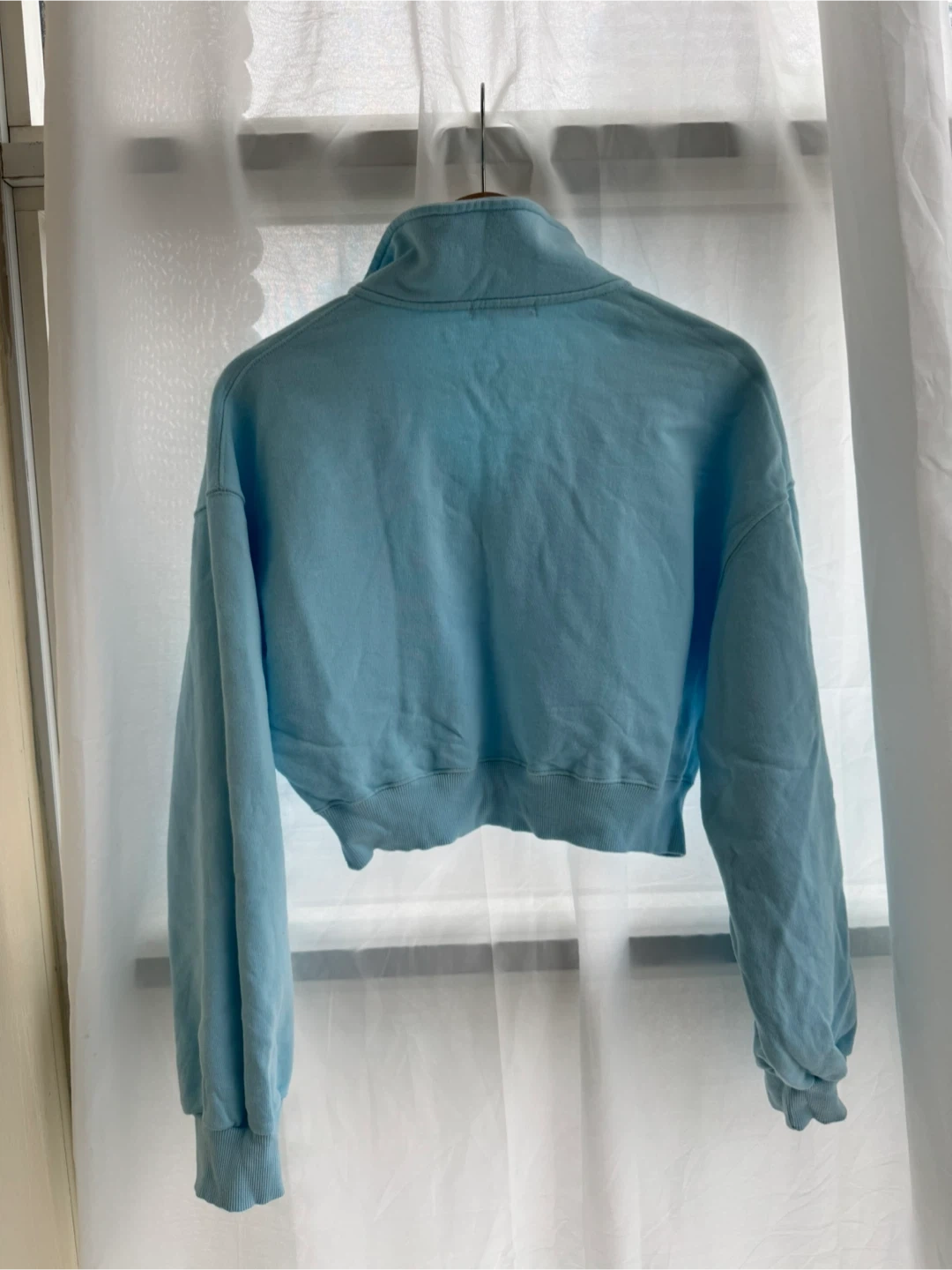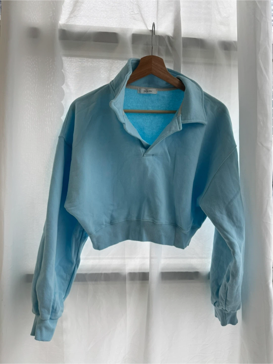 cropped pullover in a lovely light blue colour! It's a size small and in great condition. Perfect for layering or wearing on its own. It has a unique collar detail that adds a touch of style to a classic sweatshirt design
