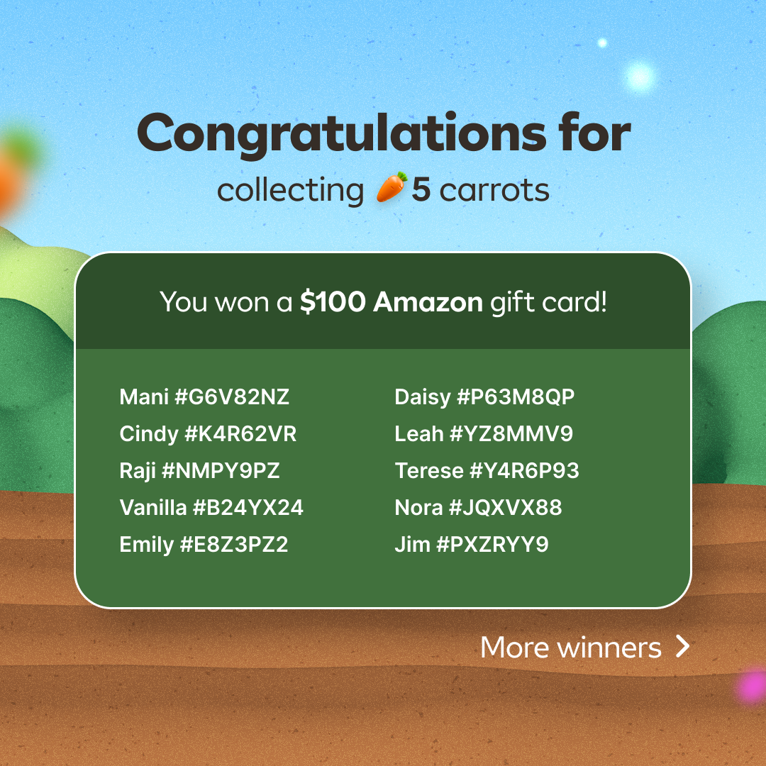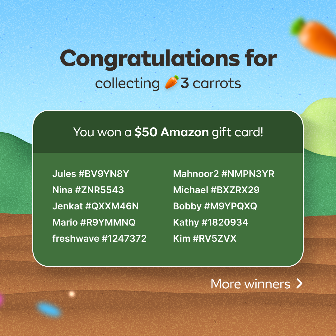 Hey Karroters! Thanks for participating in our Collect the Carrots event 🥕💚 We appreciate everyone who participated this time, and were excited to see all your spring cleaning items! Drumroll, please… 🥁 Let’s find out who successfully collected the carrots and snagged a win! Please check the image above to see the list of winners 🏆 Amazon Gift Card Winners 1. Please check your "My Rewards" section in the app. Gift cards have all been sent out! 2. Some users may share the same name so please check the unique user number. To view your user number go to My Karrot > View profile. Our team has already reached out to all winners individually. 3. Share your excitement with the Karrot community in the comments down below! Don’t be discouraged if you didn't win this time, we run events at Karrot often! Remember that these events are about more than just the rewards. You’re making someone’s day and helping us build a more community-based marketplace. Thanks for tuning in and keep checking Karrot for more events like these 💗