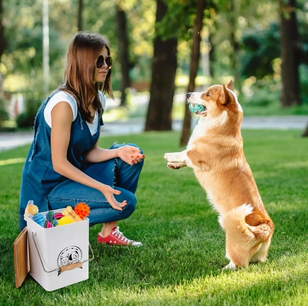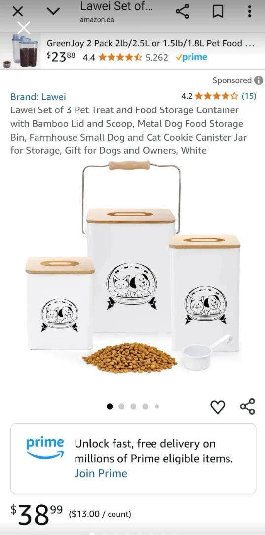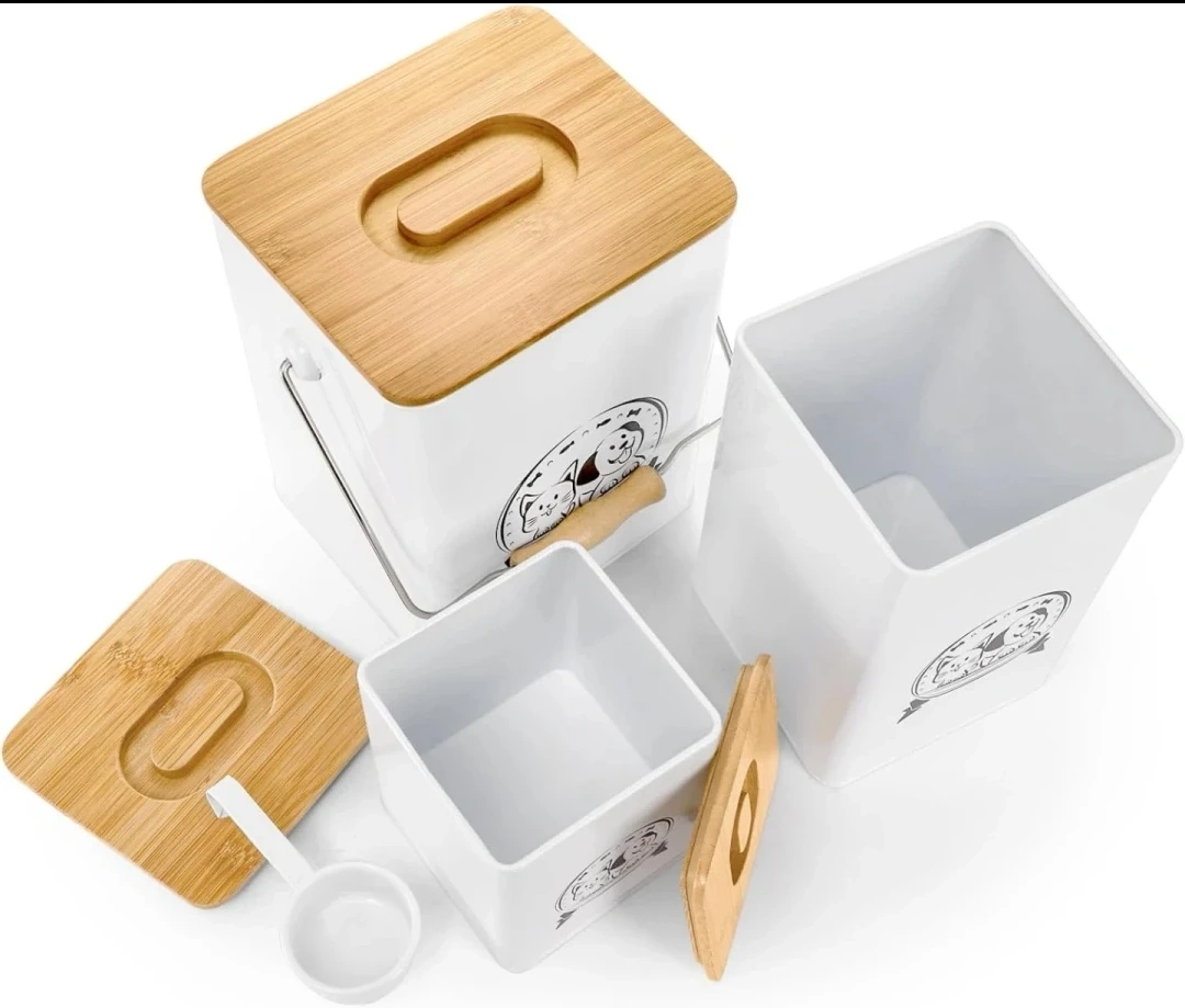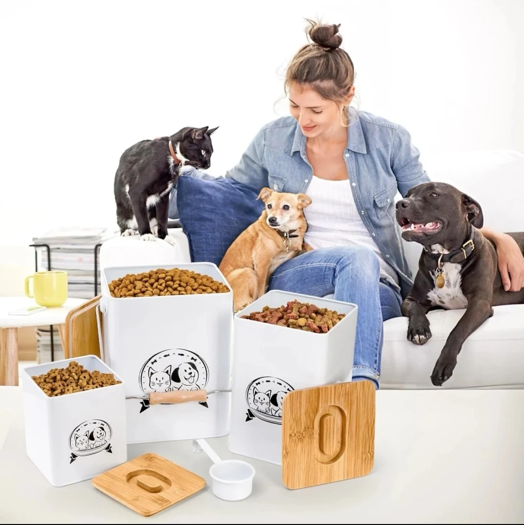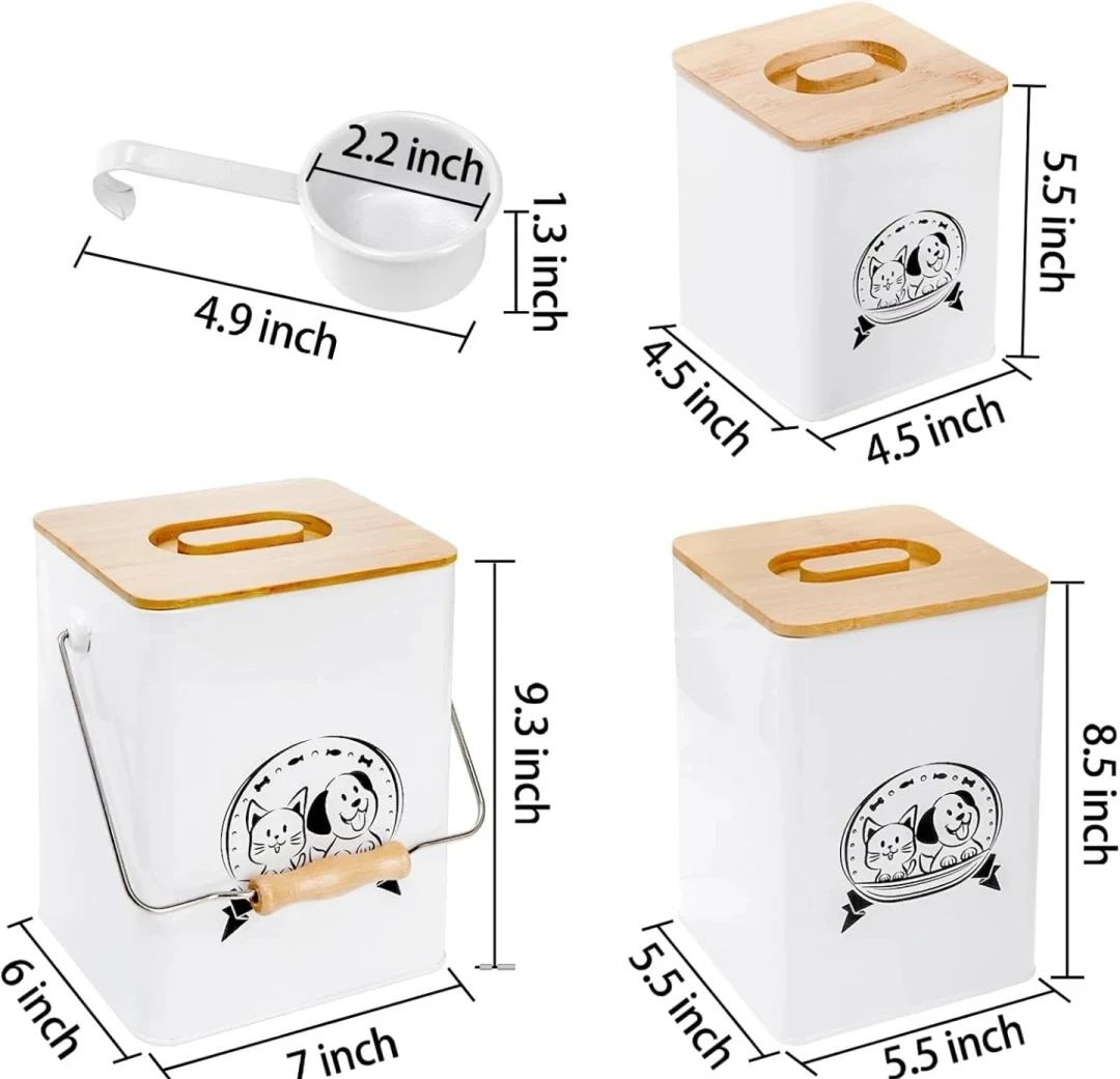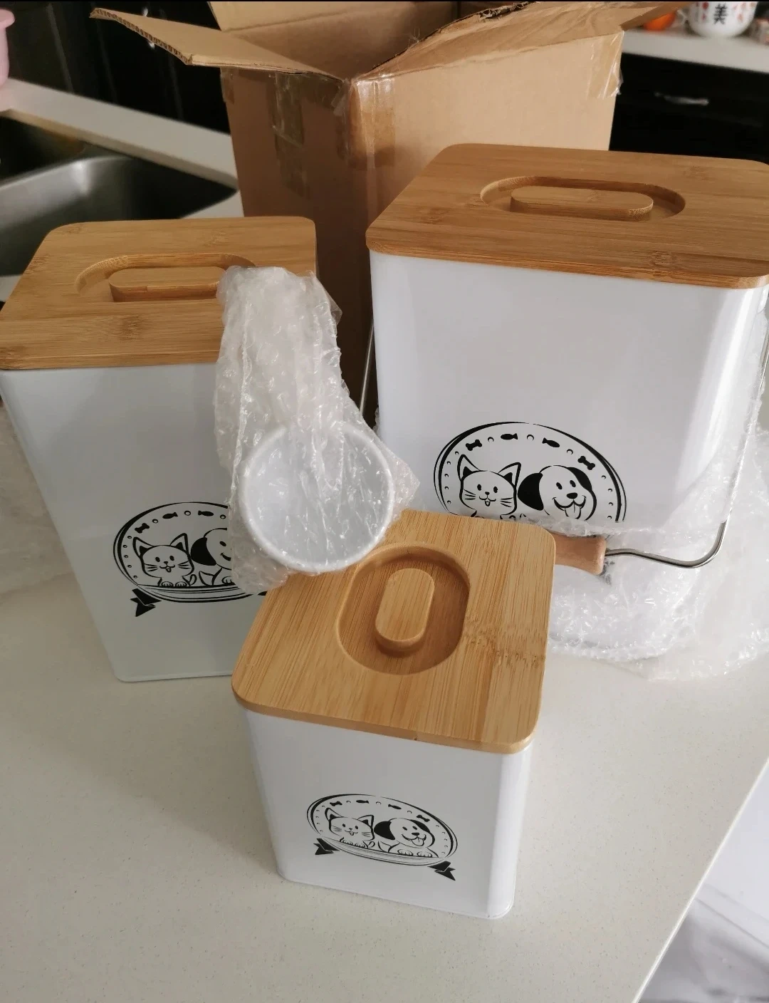 I'm selling a brand new Lawei set of 3 pet treat containers for dogs and owners! They are white with bamboo lids and feature a cute design. The set includes a small scoop. The dimensions are: - Small container: 4.5 x 4.5 x 5.5 inches - Medium container: 5.5 x 5.5 x 8.5 inches - Large container: 7 x 6 x 9.3 inches - Scoop: 4.9 x 2.2 x 1.3 inches Originally bought for $38.99!
