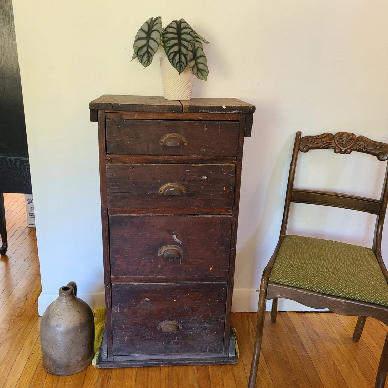 Selling a vintage wooden cabinet with four drawers. It has a rustic look with aged wood and metal handles. Perfect for adding a touch of old-world charm to your home or workspace!