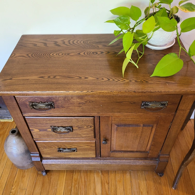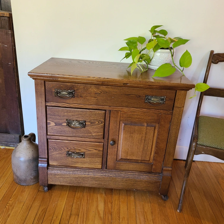 It has a combination of drawers and a cabinet space, perfect for storage. It's a unique piece that would add character to any room!