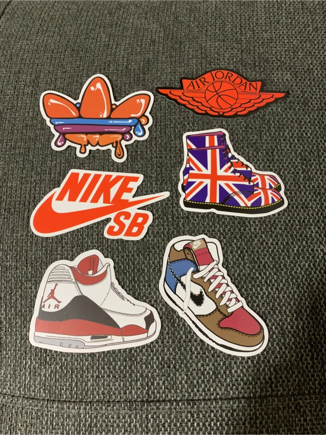 Selling a set of stickers featuring popular brands like Adidas, Nike SB, and Air Jordan. These are perfect for decorating laptops, water bottles, or any other surface you want to personalize