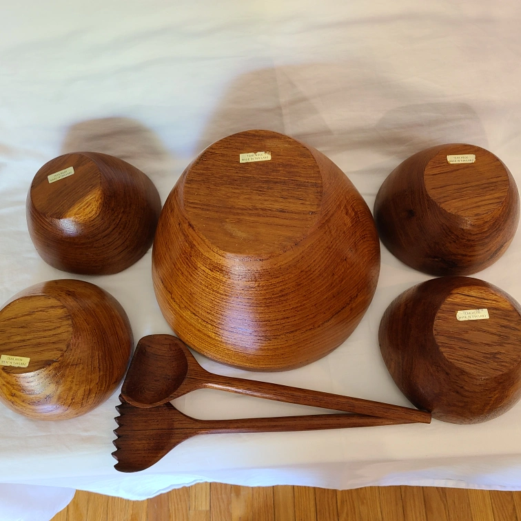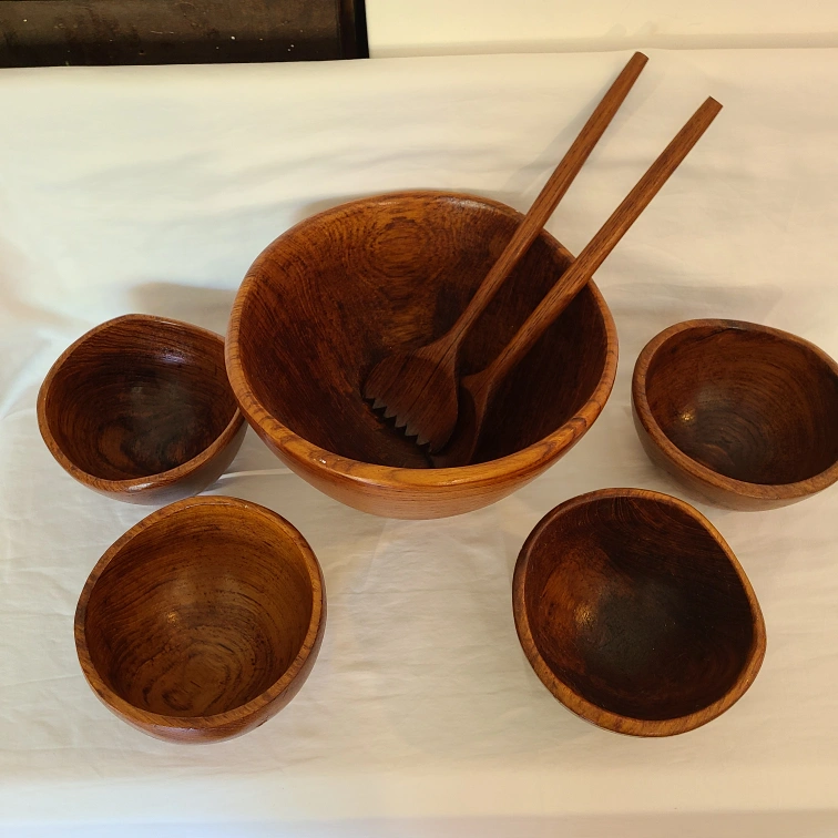 Here's a beautiful vintage teak wood salad bowl set! It includes one large bowl, four smaller bowls, and a serving spoon and fork. The set is in great condition and ready to be the centrepiece of your next dinner party! never been used! bought and sat in a cabinet this is ready to come home to you! pick up only, no holds, cash only