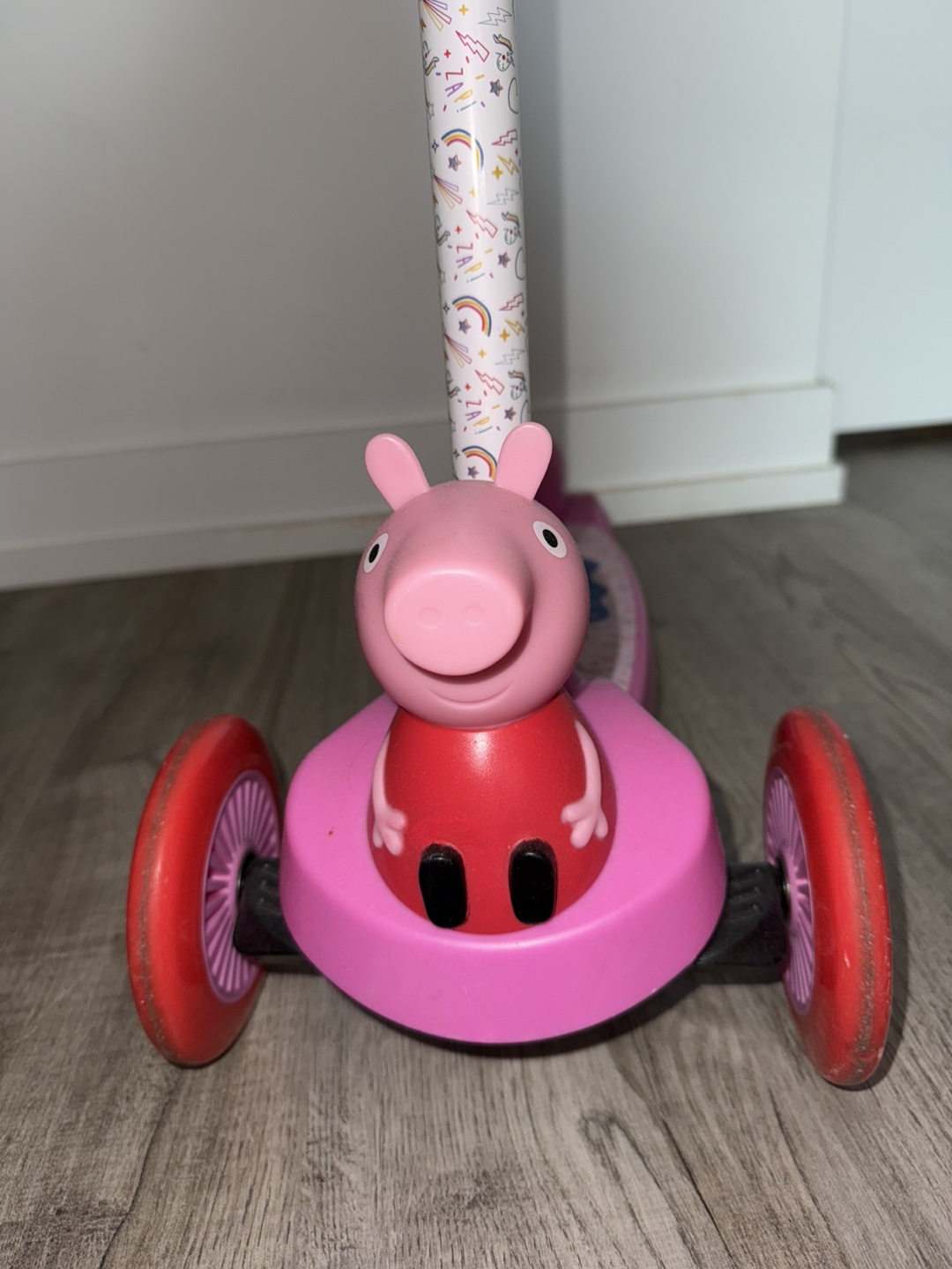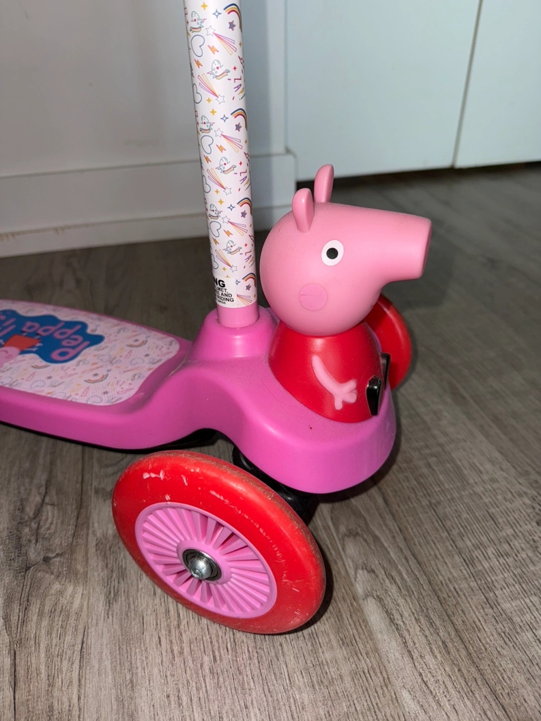 Selling a cute Peppa Pig scooter! It's a three-wheel design, perfect for little ones learning to balance. The scooter is pink with Peppa Pig graphics on the footboard. Great for toddlers!