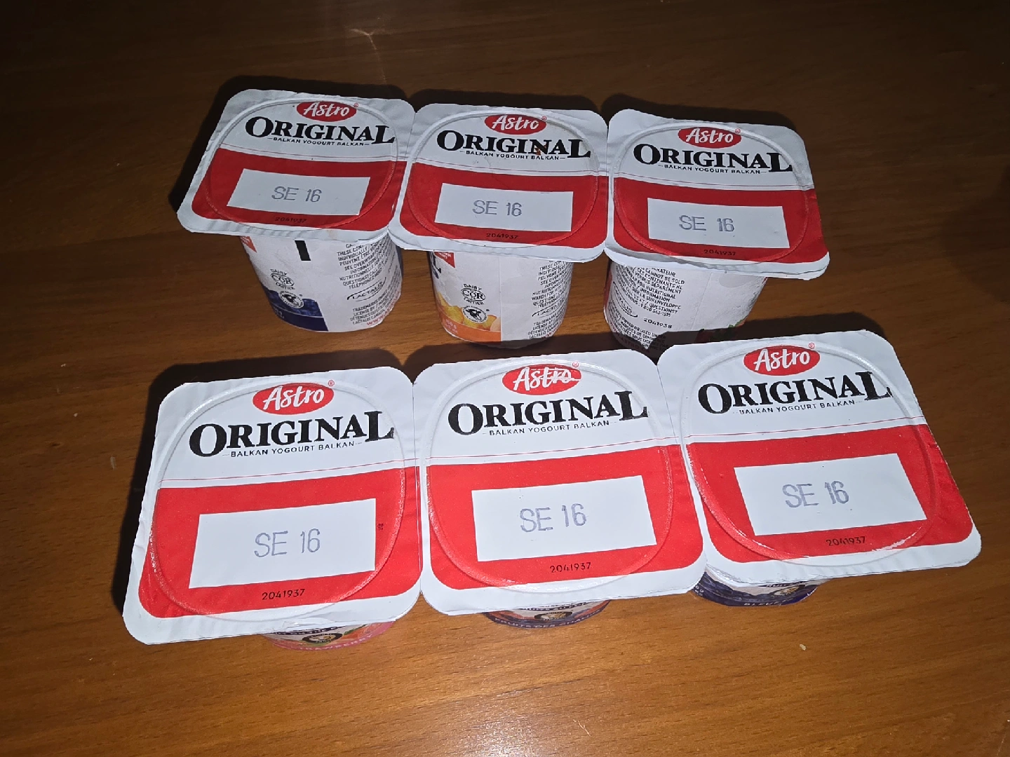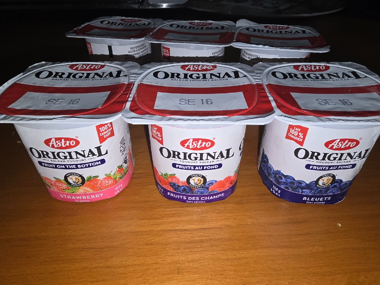 Selling six individual containers of Astro Original Balkan Yogurt. There are three different flavours: strawberry, mixed berries, and blueberry.