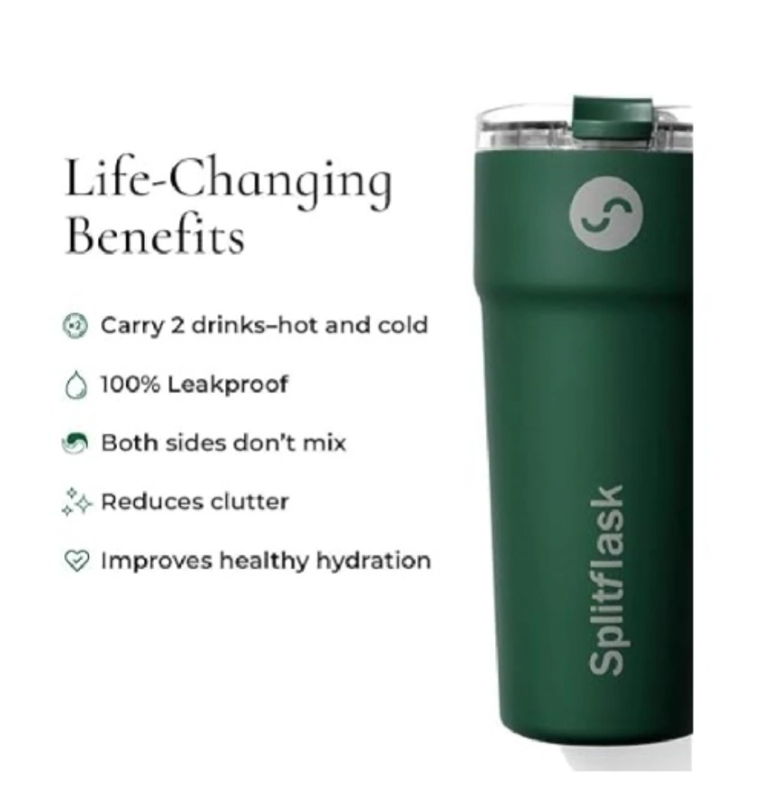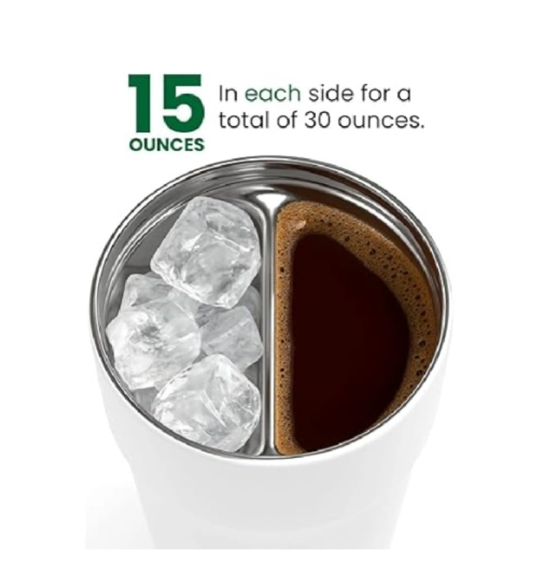 Check out this Splitflask tumbler! It's a 30oz tumbler with dual chambers, so you can keep your hot and cold drinks separate. It's BPA/BPS free, vacuum insulated, and leakproof. The tumbler is dishwasher safe and car cup holder compatible.