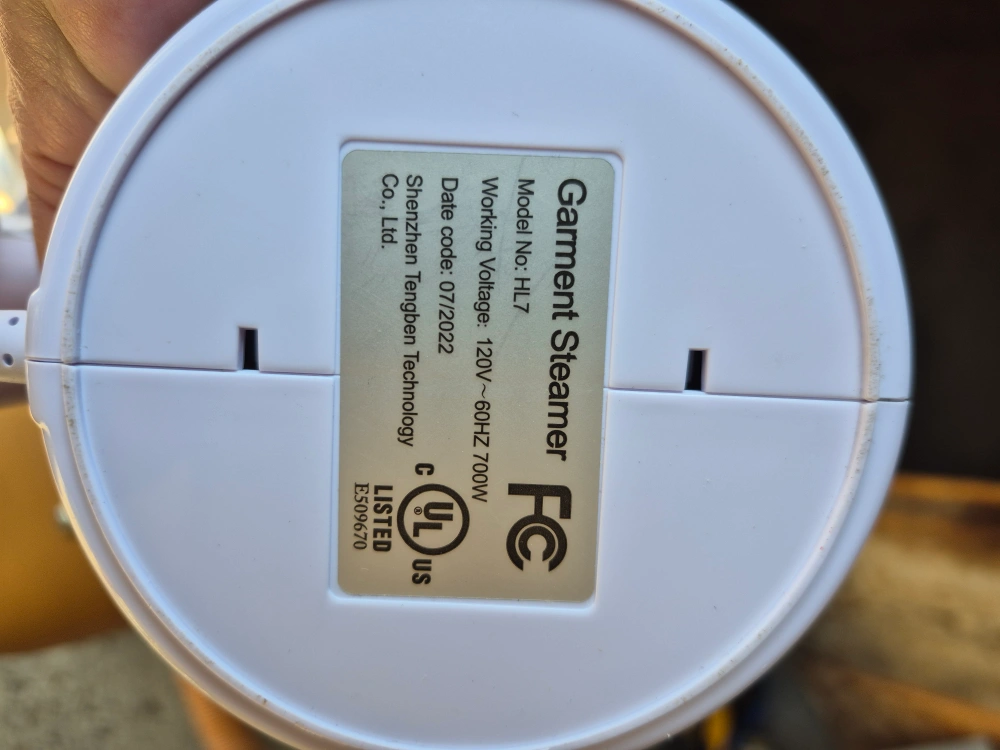 Selling a garment steamer, model number HL7. It's in great shape and ready to use! The working voltage is 120V ~ 60Hz 700W. Date code: July 2022