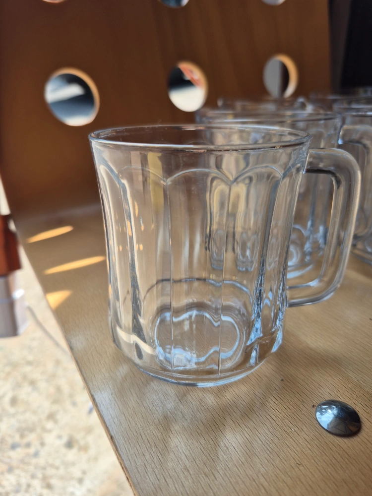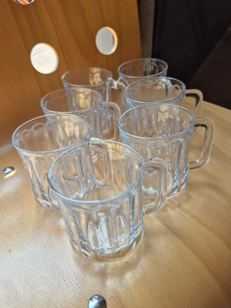Selling a set of seven clear glass mugs. They're in great shape and ready for your favourite hot drinks or even a cold beverage on a hot day! They're perfect for everyday use or for entertaining guests location is Bathurst and Dundas street area on Euclid avenue porch pickup only