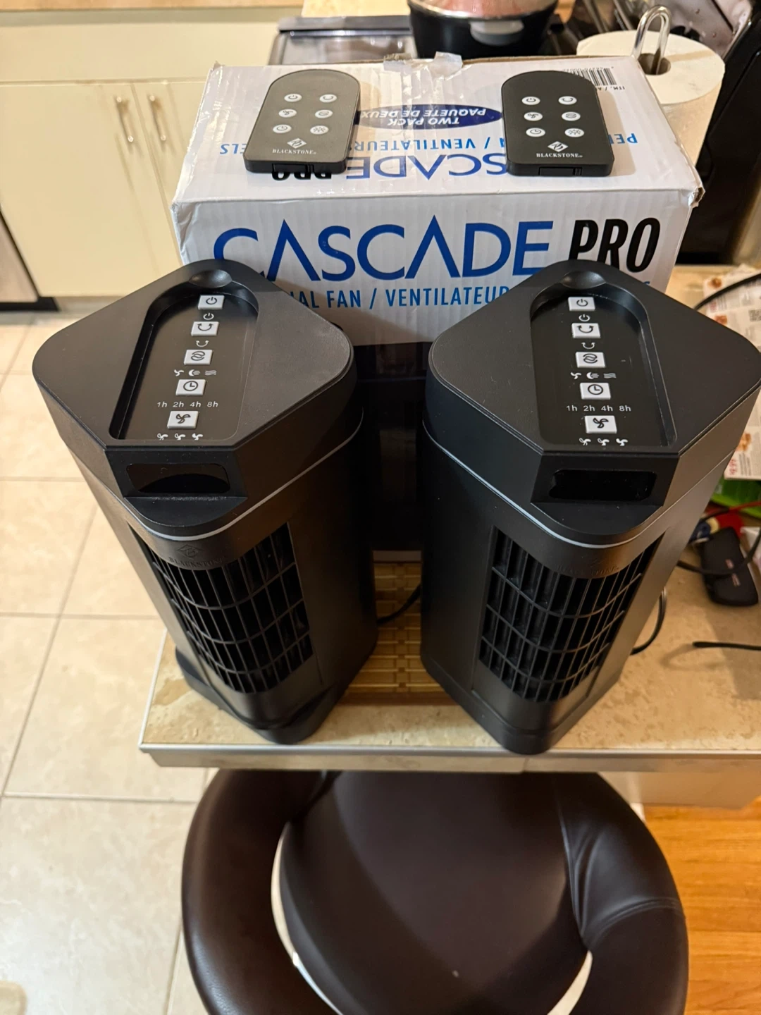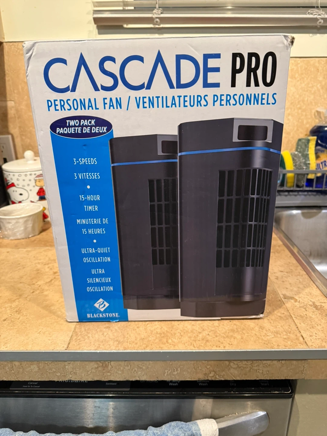I am selling a set of Cascade Pro personal fans that are in new condition, still in the original packaging. These fans feature 3-speeds, a 15-hour timer, and ultra-quiet oscillation, perfect for personal comfort.