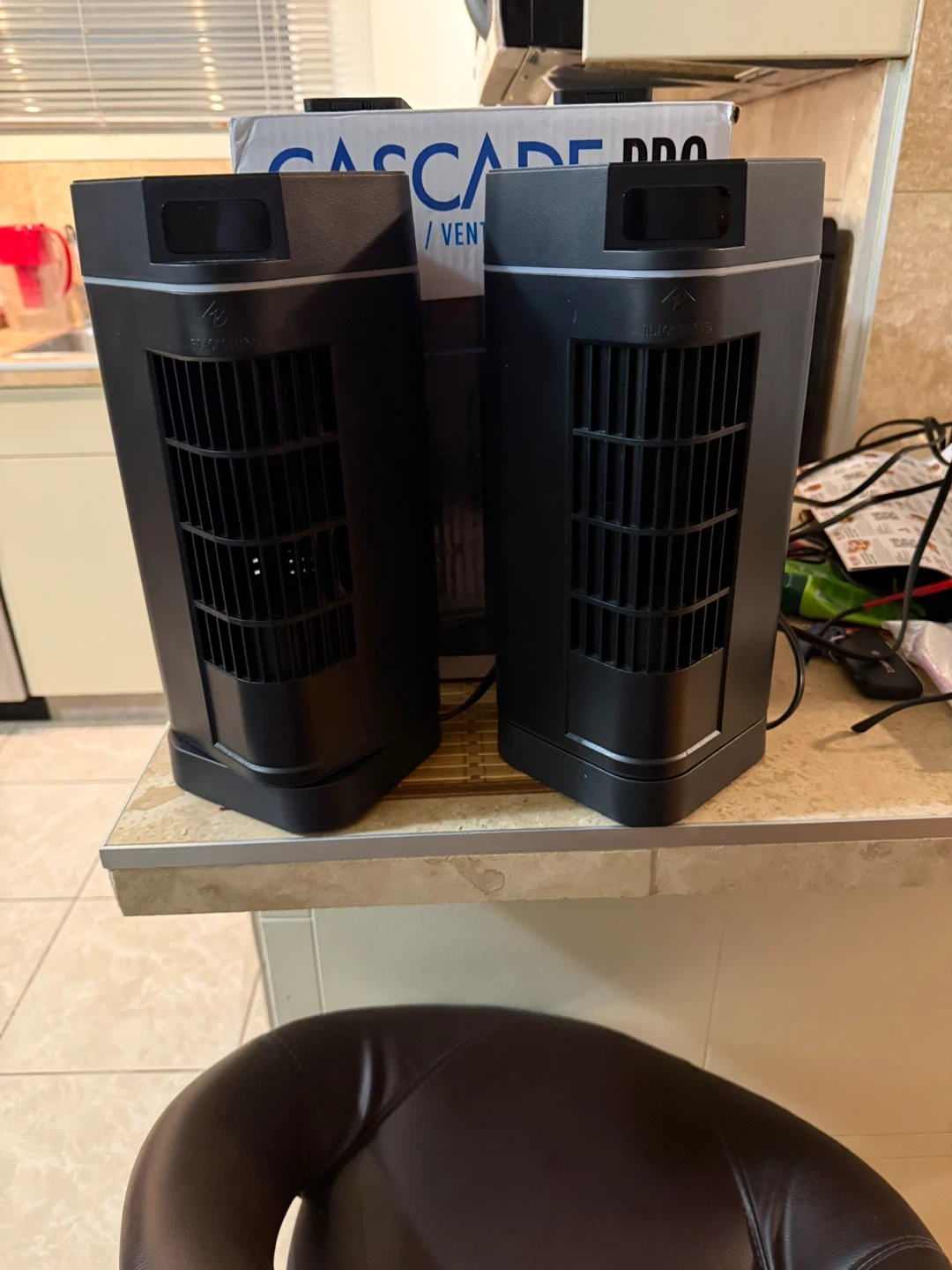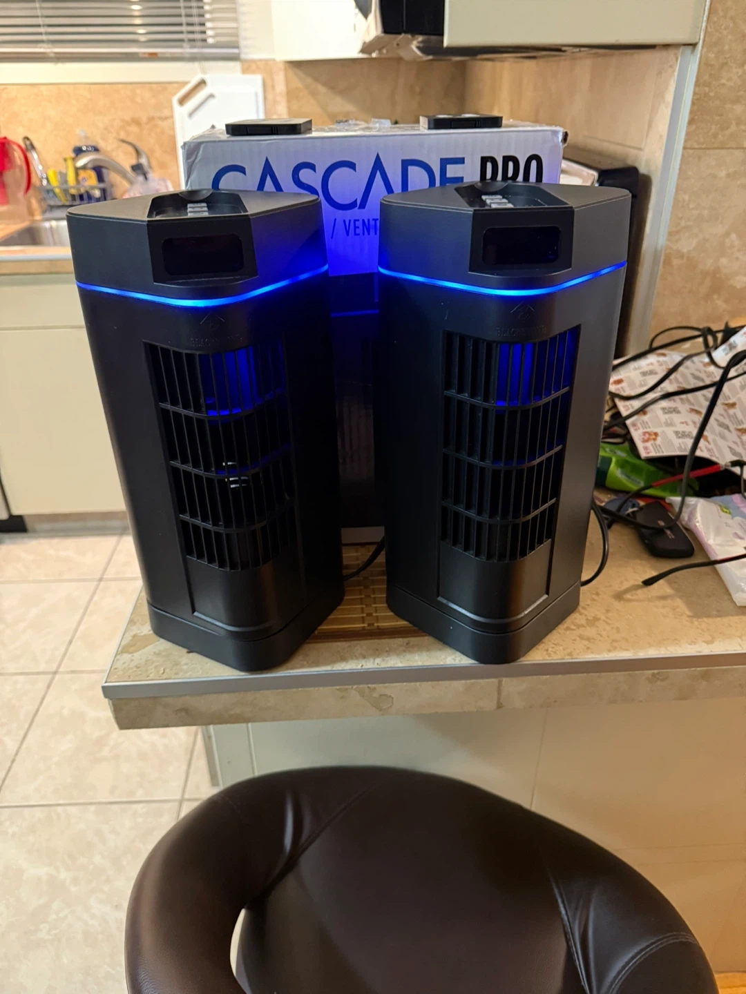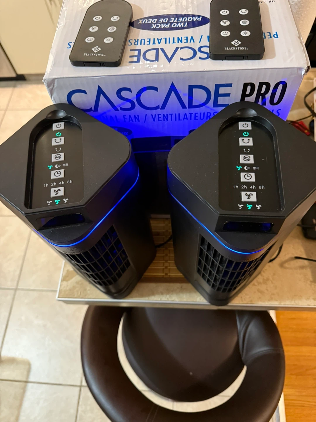 I am selling a set of Cascade Pro personal fans that are in new condition, still in the original packaging. These fans feature 3-speeds, a 15-hour timer, and ultra-quiet oscillation, perfect for personal comfort.