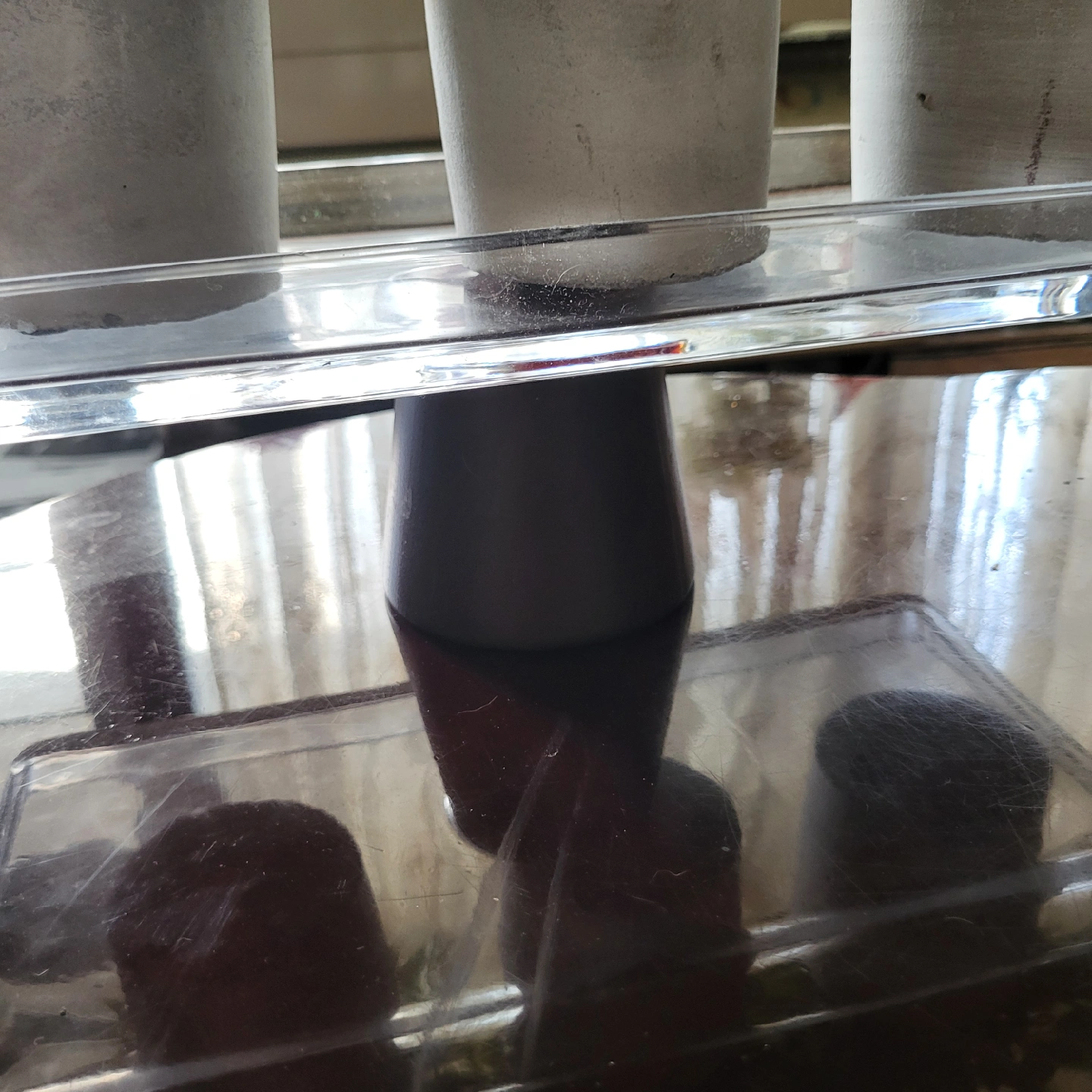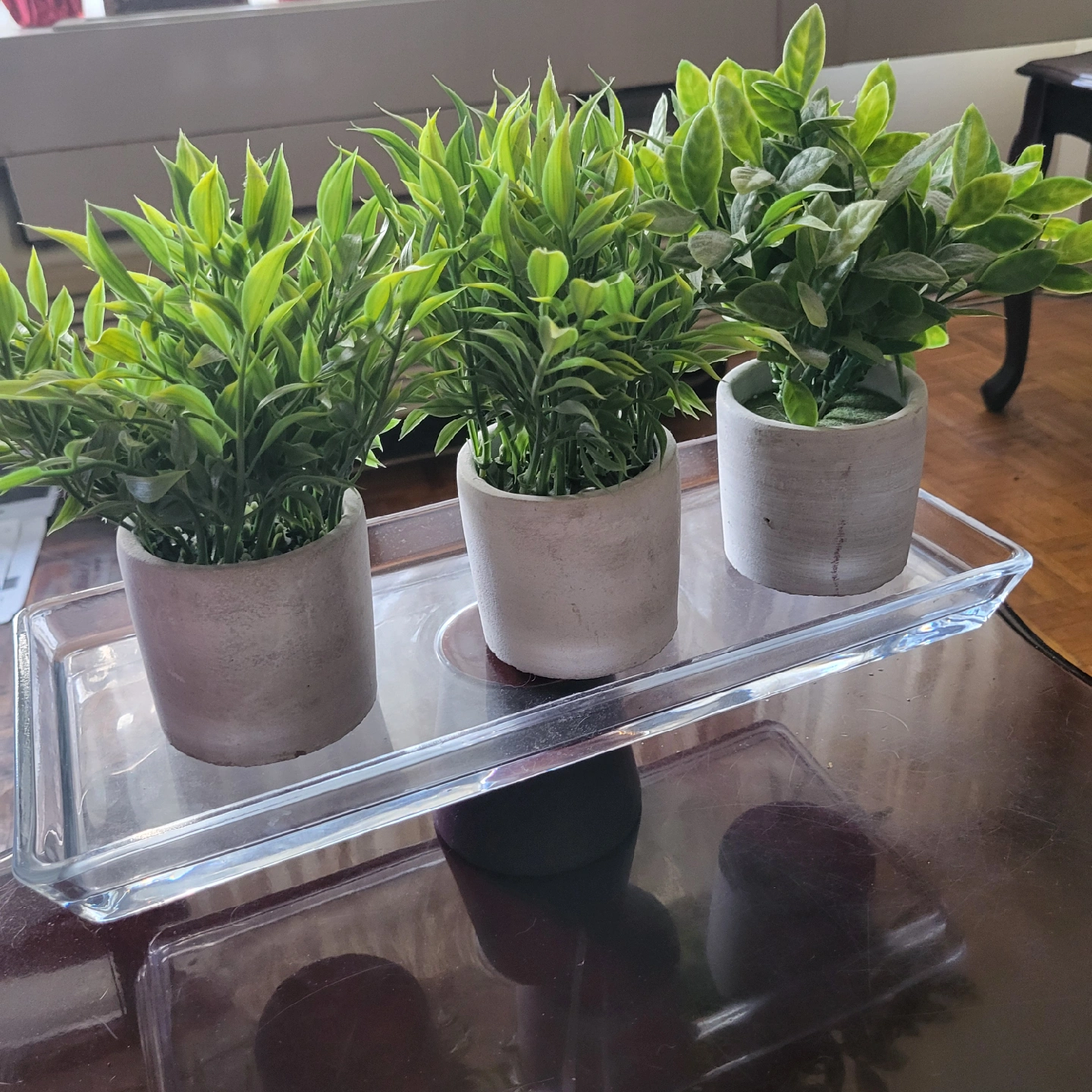 Selling a set of three artificial potted plants displayed on a clear tray. These are great for adding a touch of greenery to any space without the maintenance of real plants. They are in great condition and would look lovely on a windowsill, shelf, or table