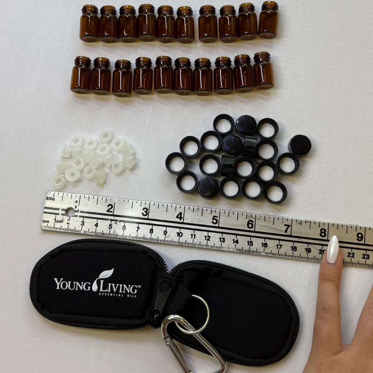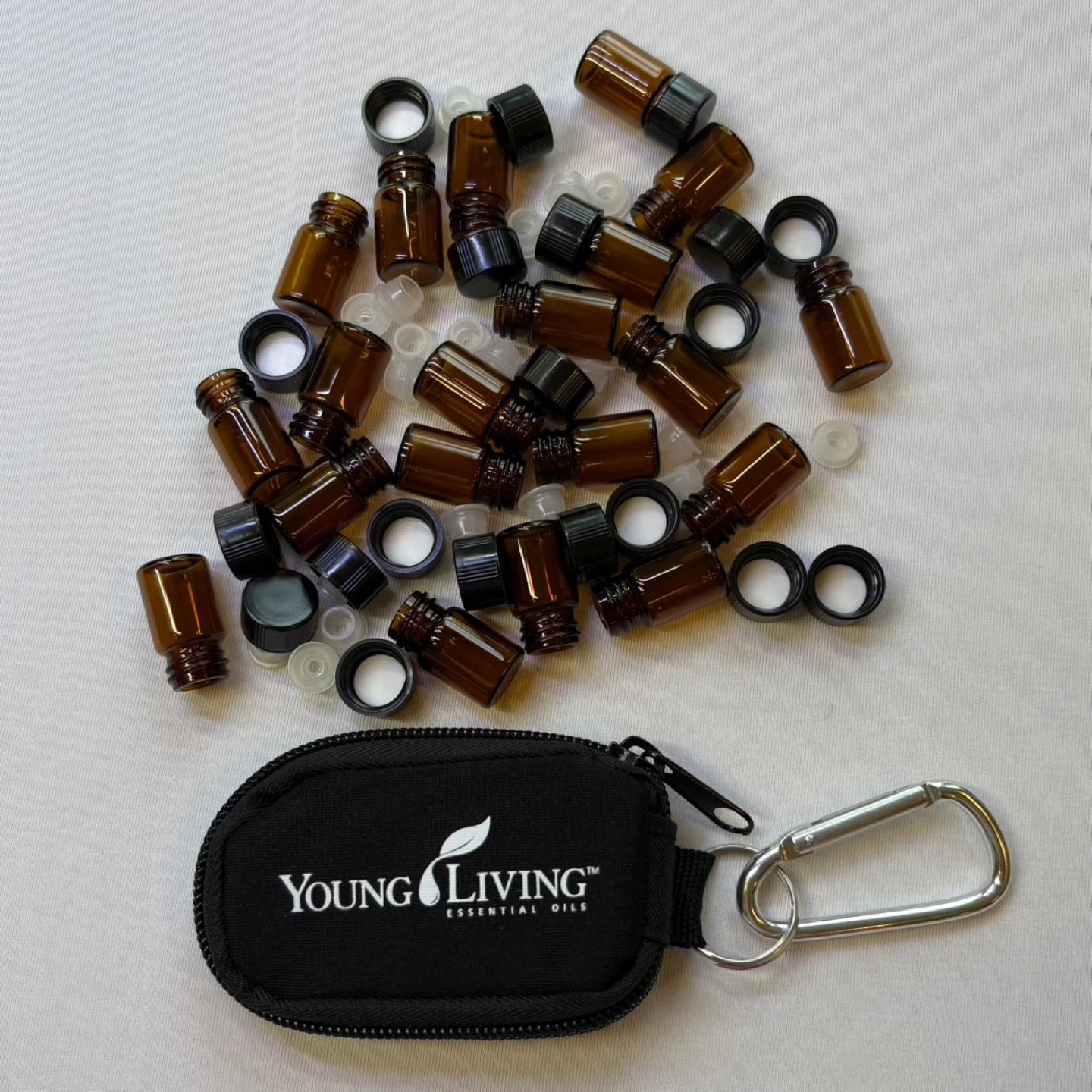 Young Living essential oil keychain case along with 20 amber-coloured glass oil bottles, perfect for storing and transporting your favourite blends. The keychain case is ideal for keeping your oils handy, and the bottles are the perfect size for samples or personal use.