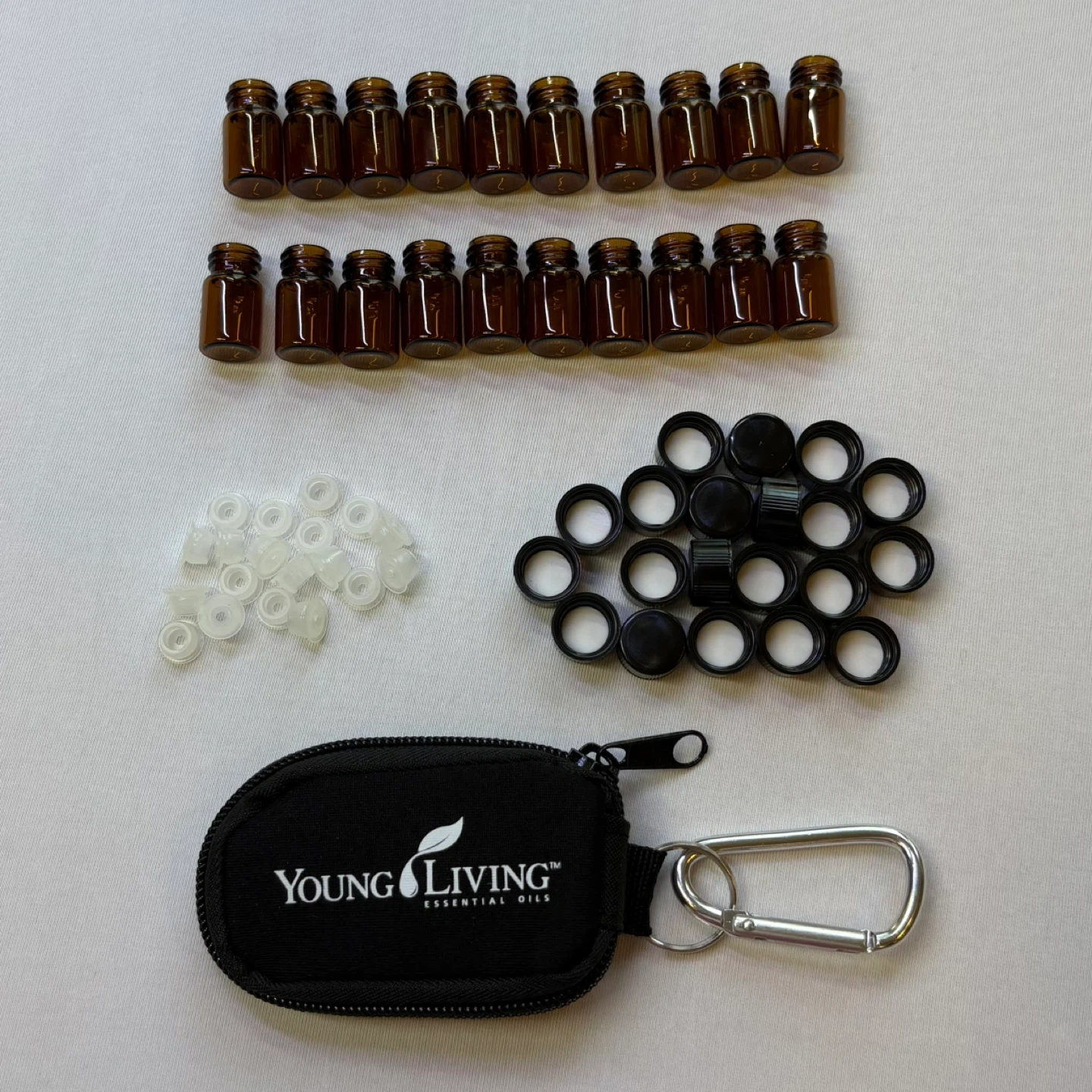 Young Living essential oil keychain case along with 20 amber-coloured glass oil bottles, perfect for storing and transporting your favourite blends. The keychain case is ideal for keeping your oils handy, and the bottles are the perfect size for samples or personal use.