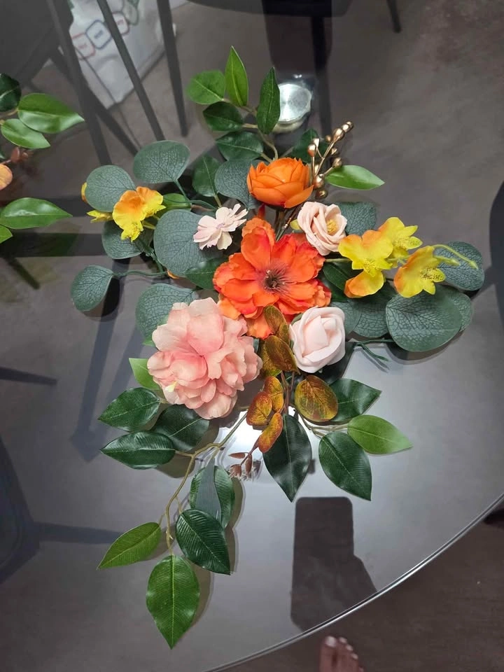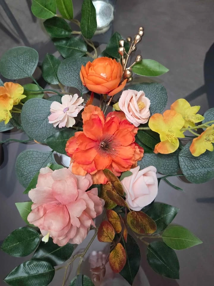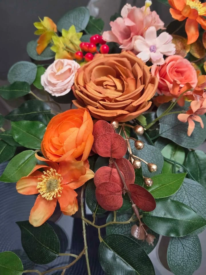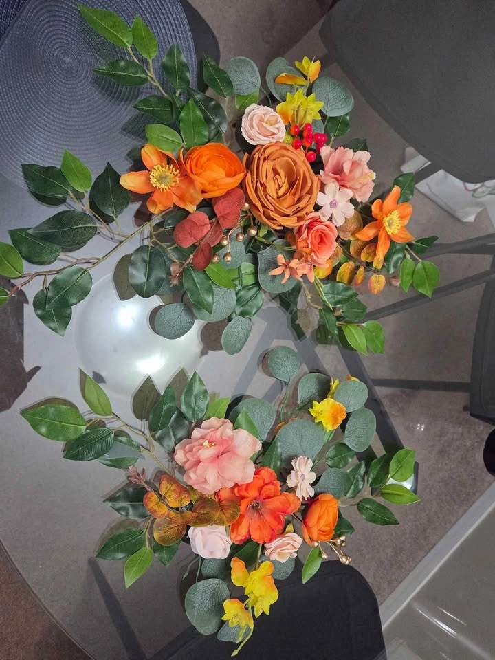 Beautiful wedding floral arrangements with artificial flowers in warm, romantic tones — roses, peonies, poppies, and eucalyptus. Perfect for decorating wedding tables, photo zones, or special events. Long-lasting, maintenance-free, and keeping their beauty all year round. Available as a set of 2.