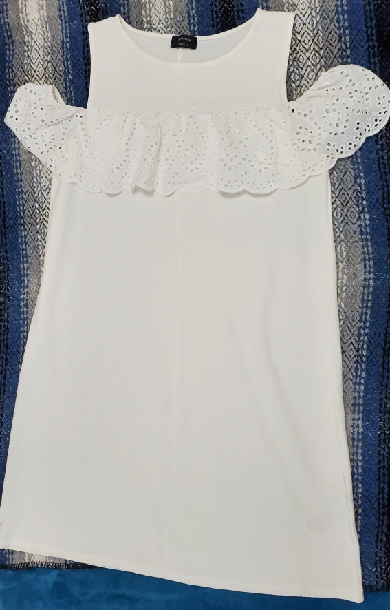 A cute and stylish shift dress from Yessica. It's a size Large and features a unique off-the-shoulder design with eyelet detailing. Perfect for a casual day out or a summer event!