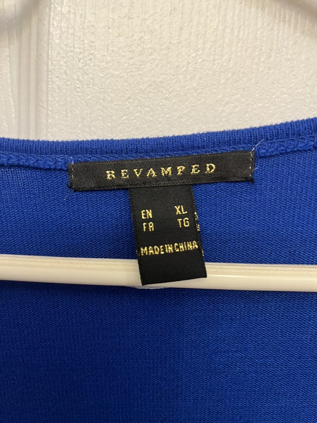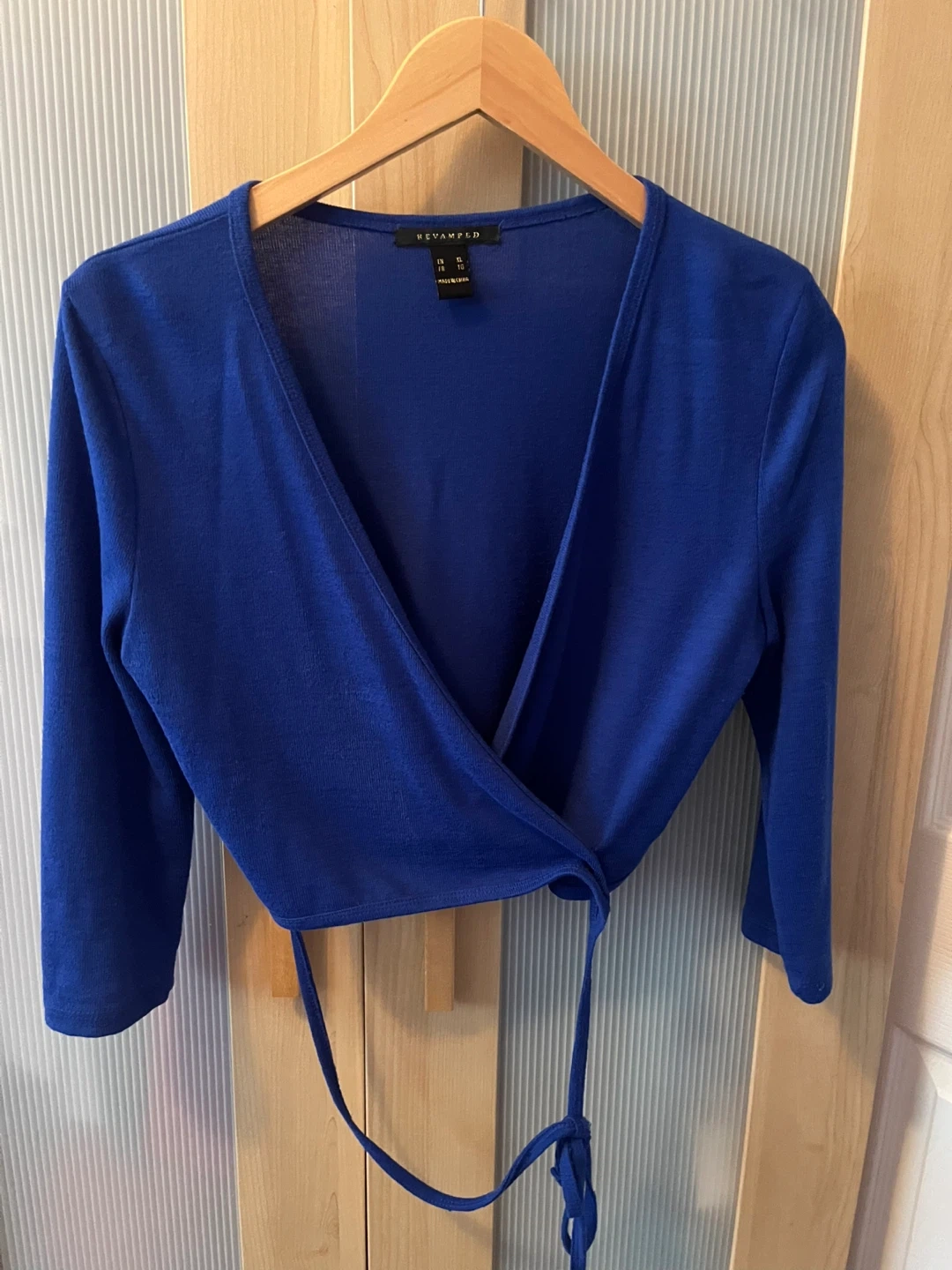 Selling a Revamped wrap top in a vibrant royal blue colour. It's a size XL and features a stylish wrap design with tie detailing. The material feels soft and comfortable. Glendale SW area. Available if ad is running .