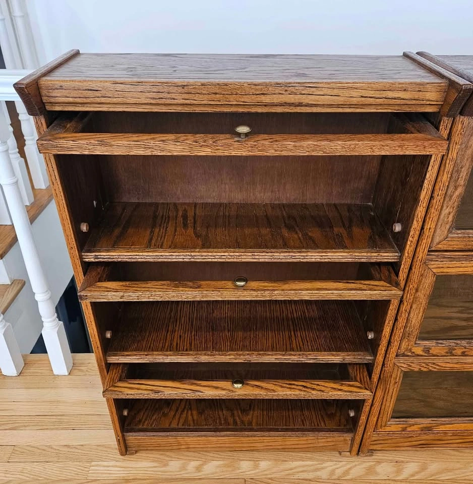 Gorgeous mission style/arts & crafts three-tiered barrister bookcase. Solid oak. Glass and sliding mechanism all intact. Brass knobs. Stamped with "inspected by Eagle Industries". Price is for the pair