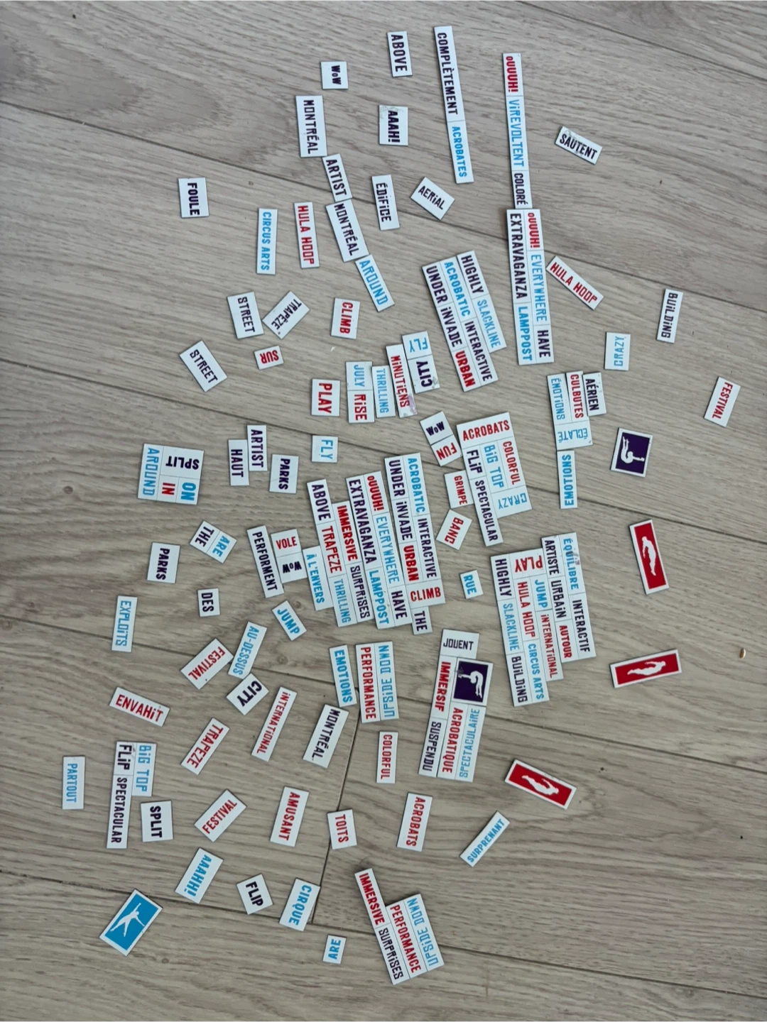 A collection of English and French word magnets related to Montreal circus arts! Great for creative writing or just having fun arranging words on your fridge. Includes words like 'acrobats,' 'Montreal,' 'hula hoop,' and more!