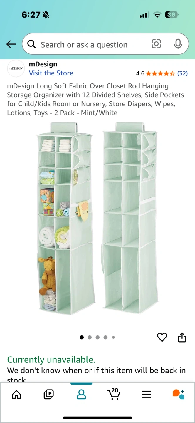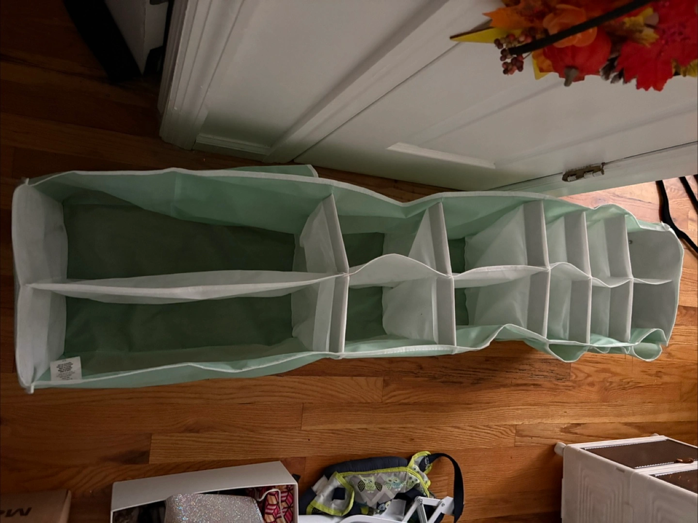 This is a hanging closet organizer in a mint green color. It's perfect for keeping your closet tidy and your items easily accessible and visible!
